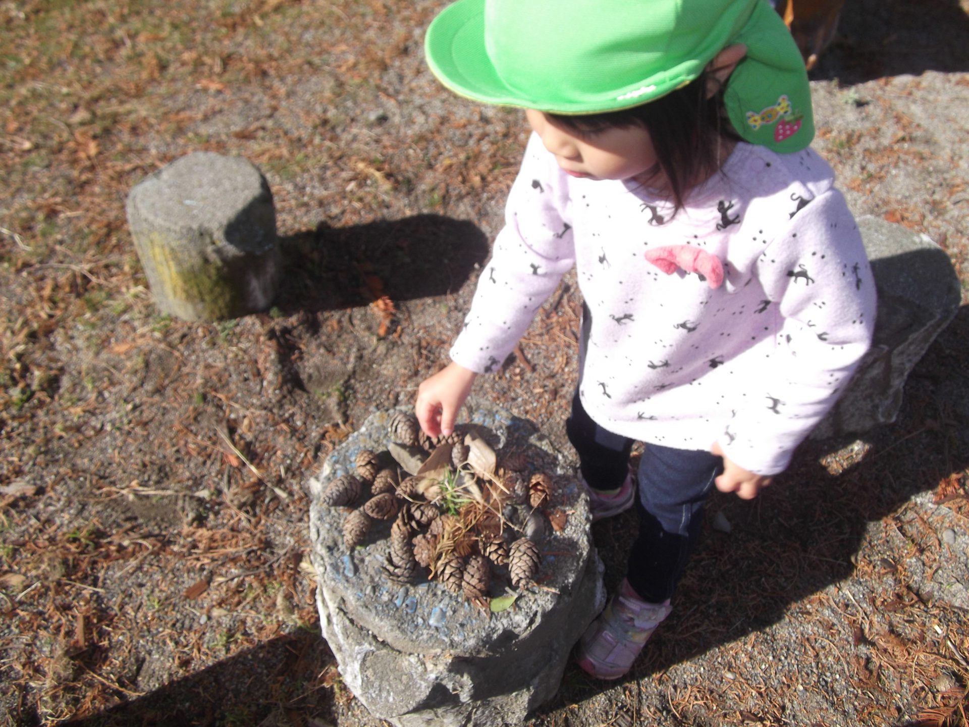 「赤い実、おいしそう」「まつぼっくりケーキだよ」