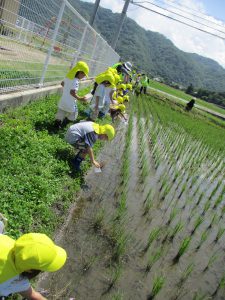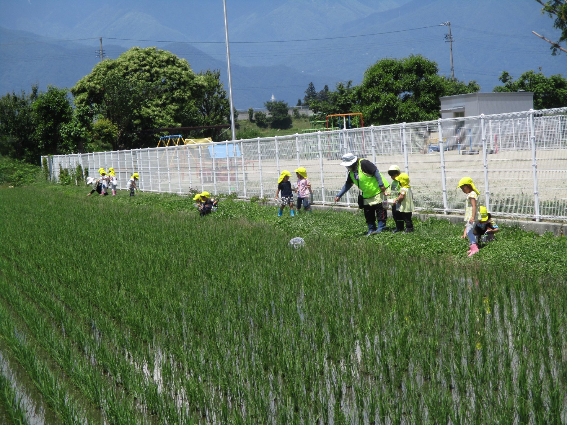 園庭の横の田んぼにおたまじゃくしがいることを発見し、毎日大きくなる姿を興味津々に見る子どもたち