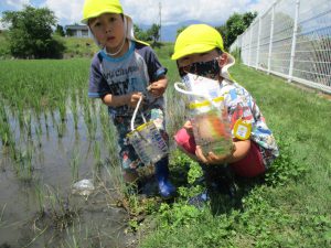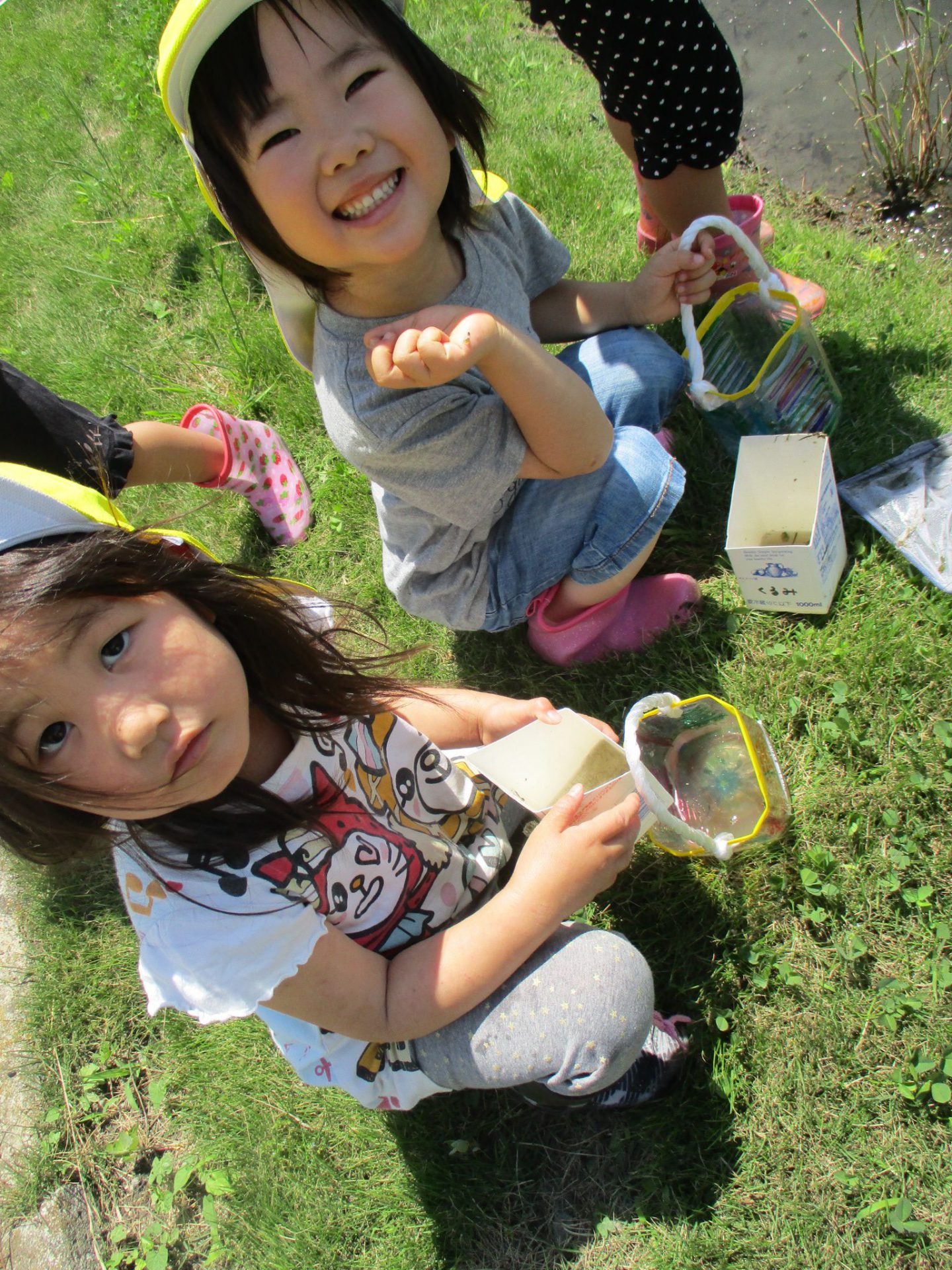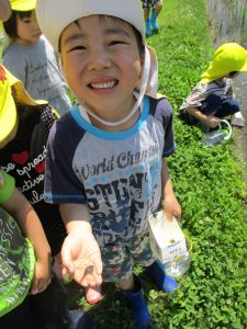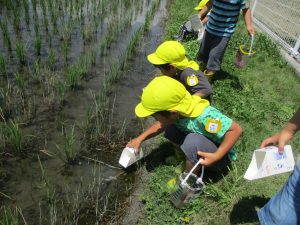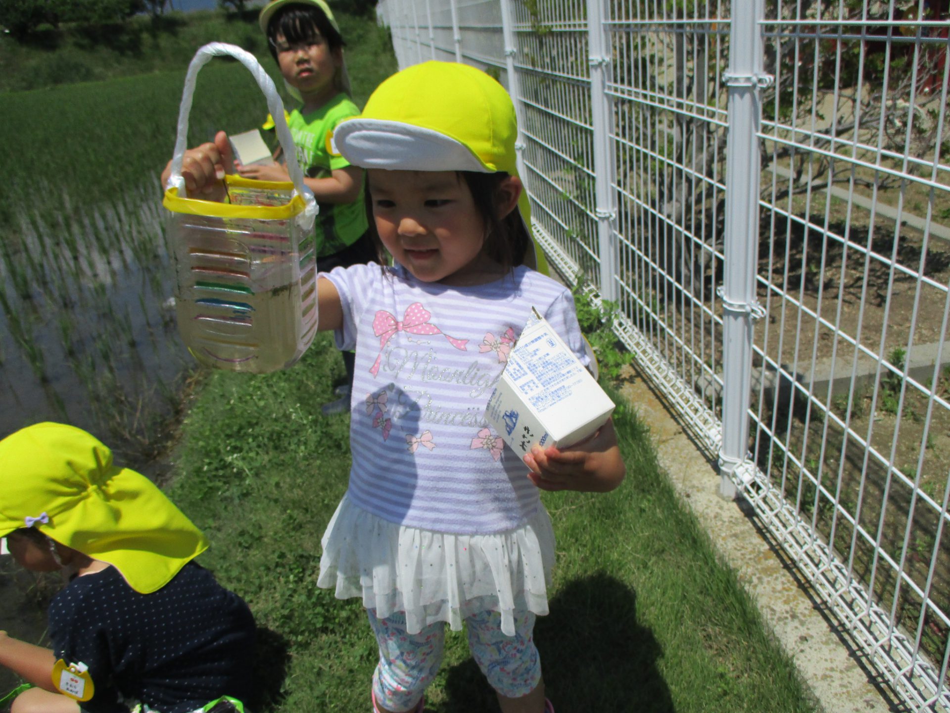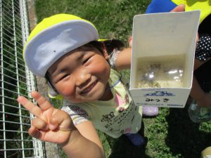 「トンボのあかちゃんもいる」「貝みたいなのもいるよー」とおたまじゃくし以外にもドジョウ、トノサマガエル、ヤゴ、タニシを見つけて大喜び