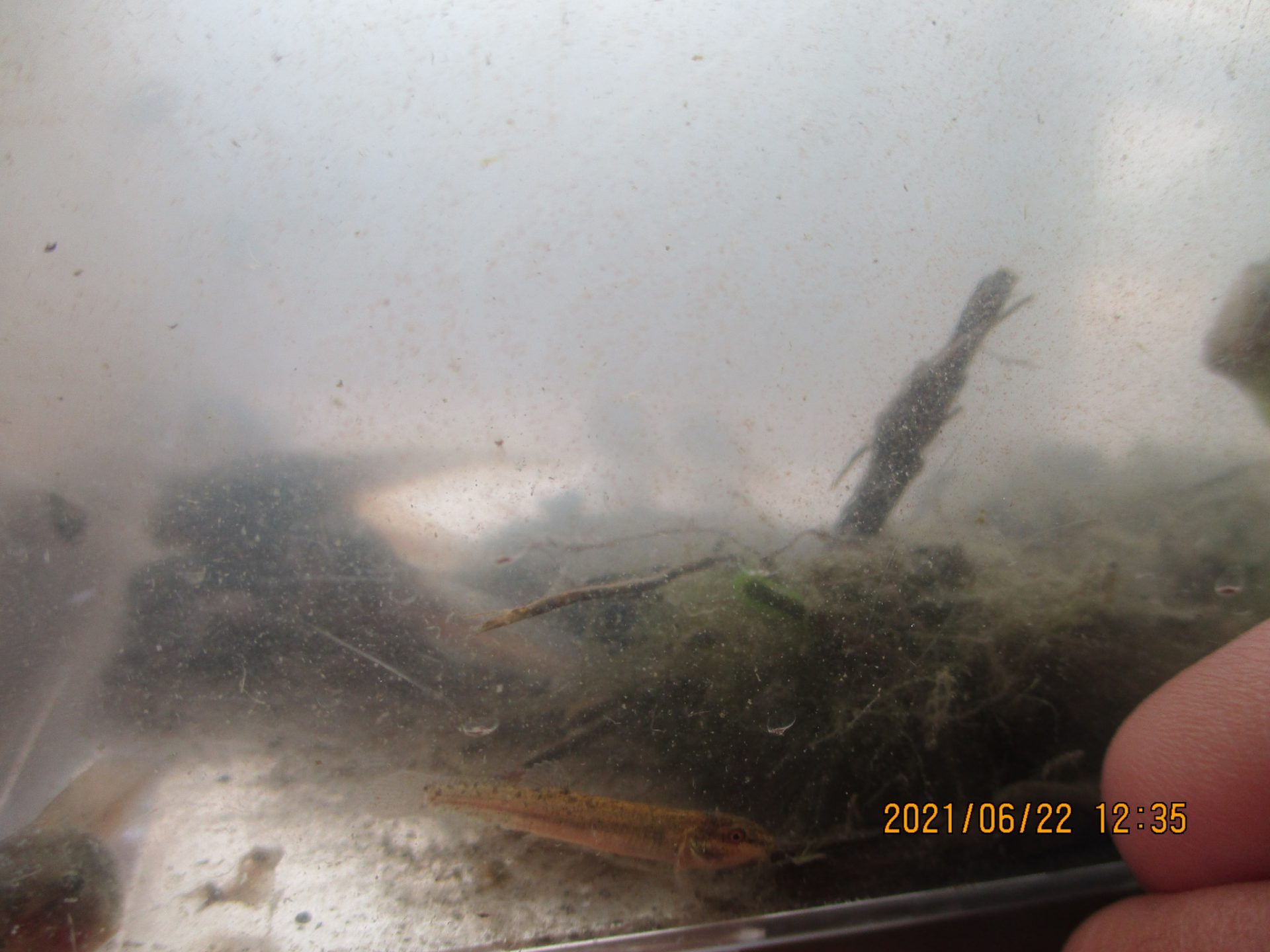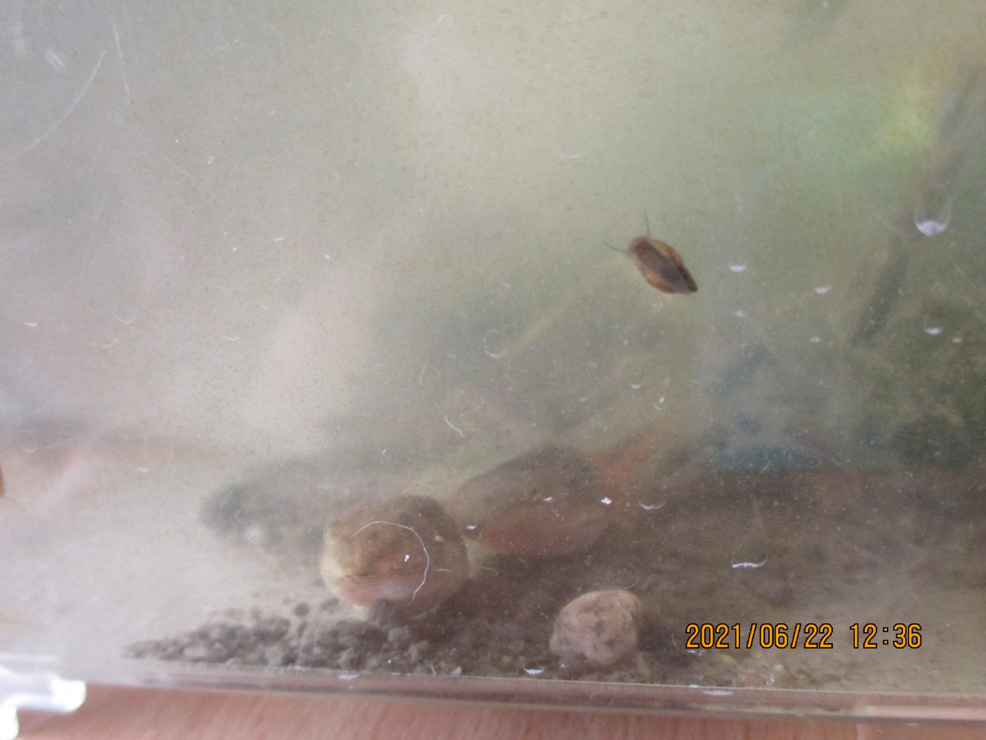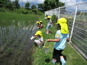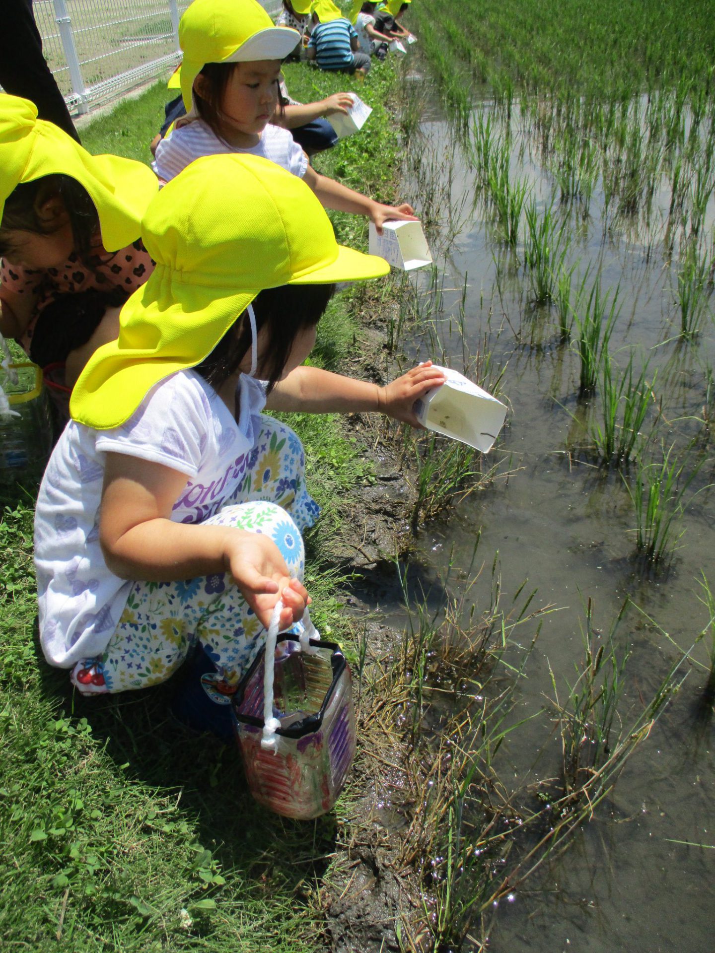 「トンボのあかちゃんもいる」「貝みたいなのもいるよー」とおたまじゃくし以外にもドジョウ、トノサマガエル、ヤゴ、タニシを見つけて大喜び