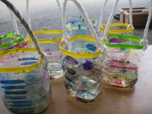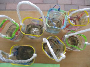 帰りぎわペットボトルで作ったお散歩バックが太陽の光でキレイに輝いて地面に映っていることを発見し