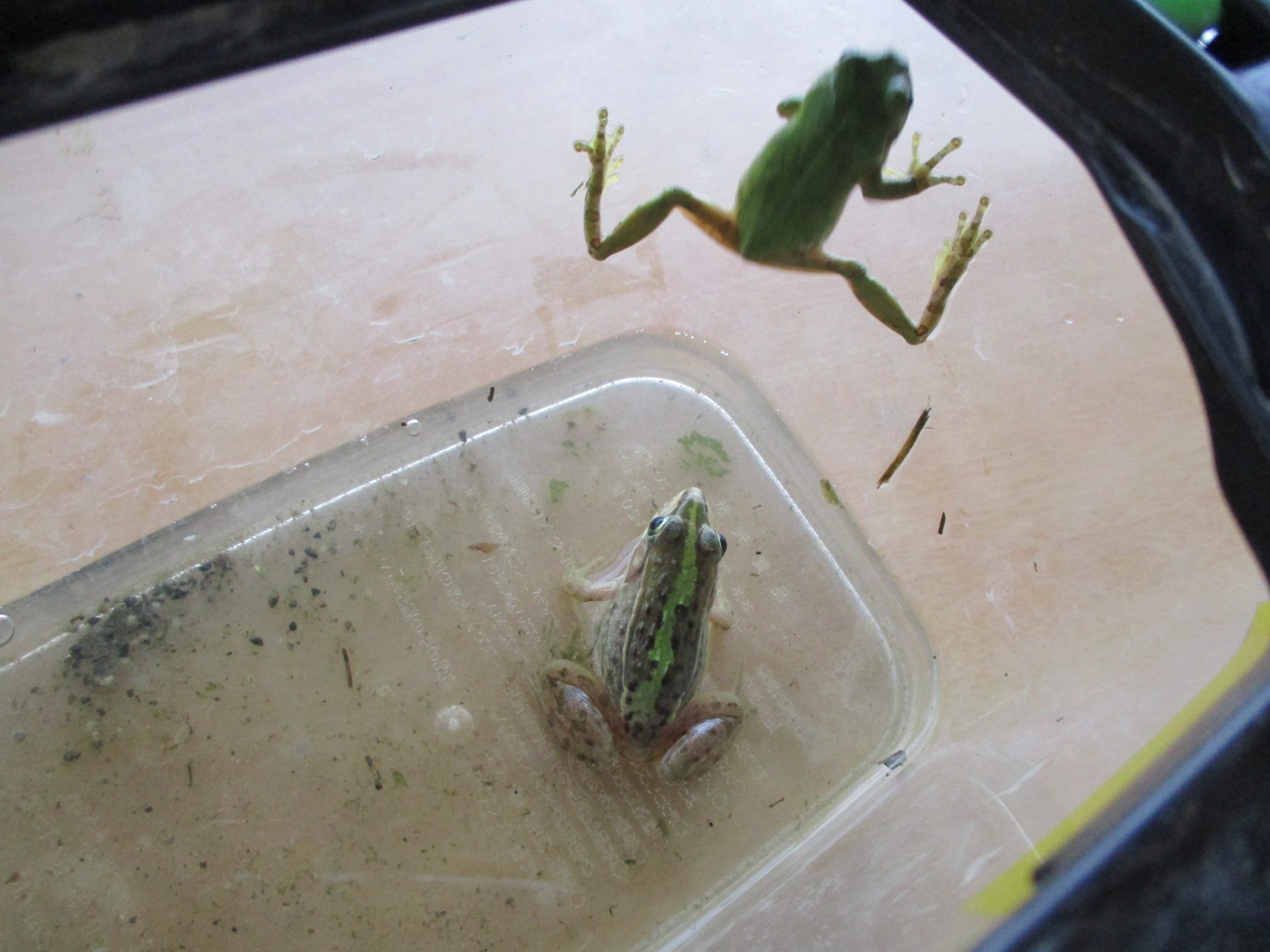 「あ、お魚みたいのがいる」「大きいカエルがいるよ!おたまじゃくしのお母さんかな」