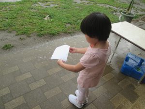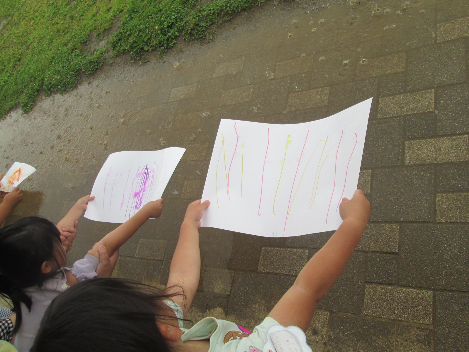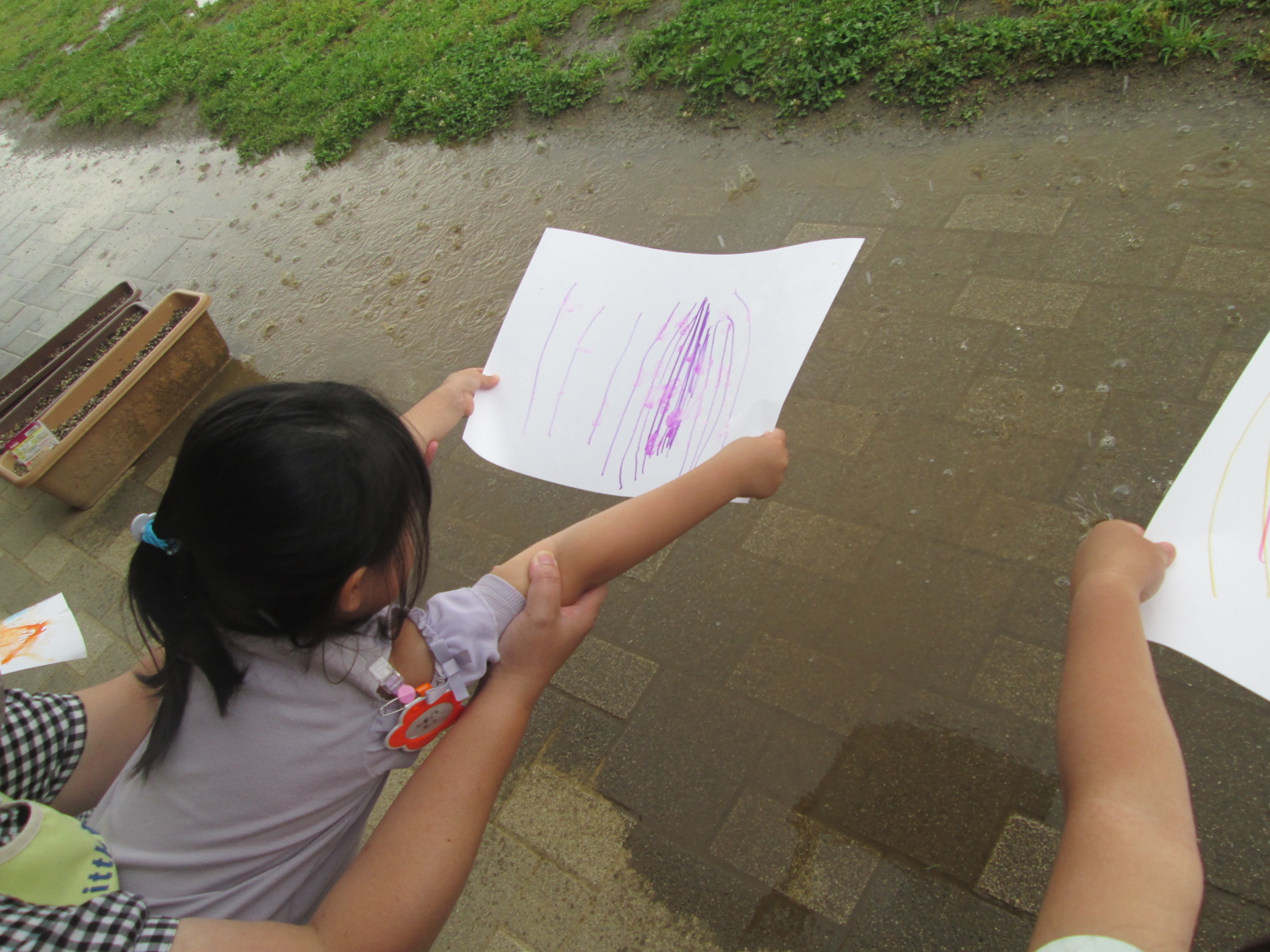雨でも楽しめるように、声をあげて目や耳、体で雨を感じてほしいと願いながらにじみ絵を考え、水性ペンで雨を描いて雨の降るのを待ちました。そして雨が降り出した時に、水性ペンの絵を雨の中に出てにじませてみせると、子どもたちは自分の絵を雨にあてて、その変化をとても喜びました。繰り返し絵を描く姿も見られ、雨降りの中でも活動が盛り上がりました。