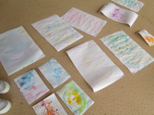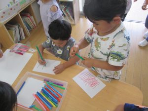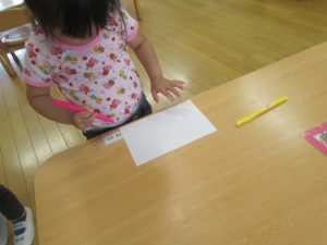 梅雨に入ってから、室内遊び中に水性ペンを使って雨を描いてみた子どもたち。