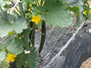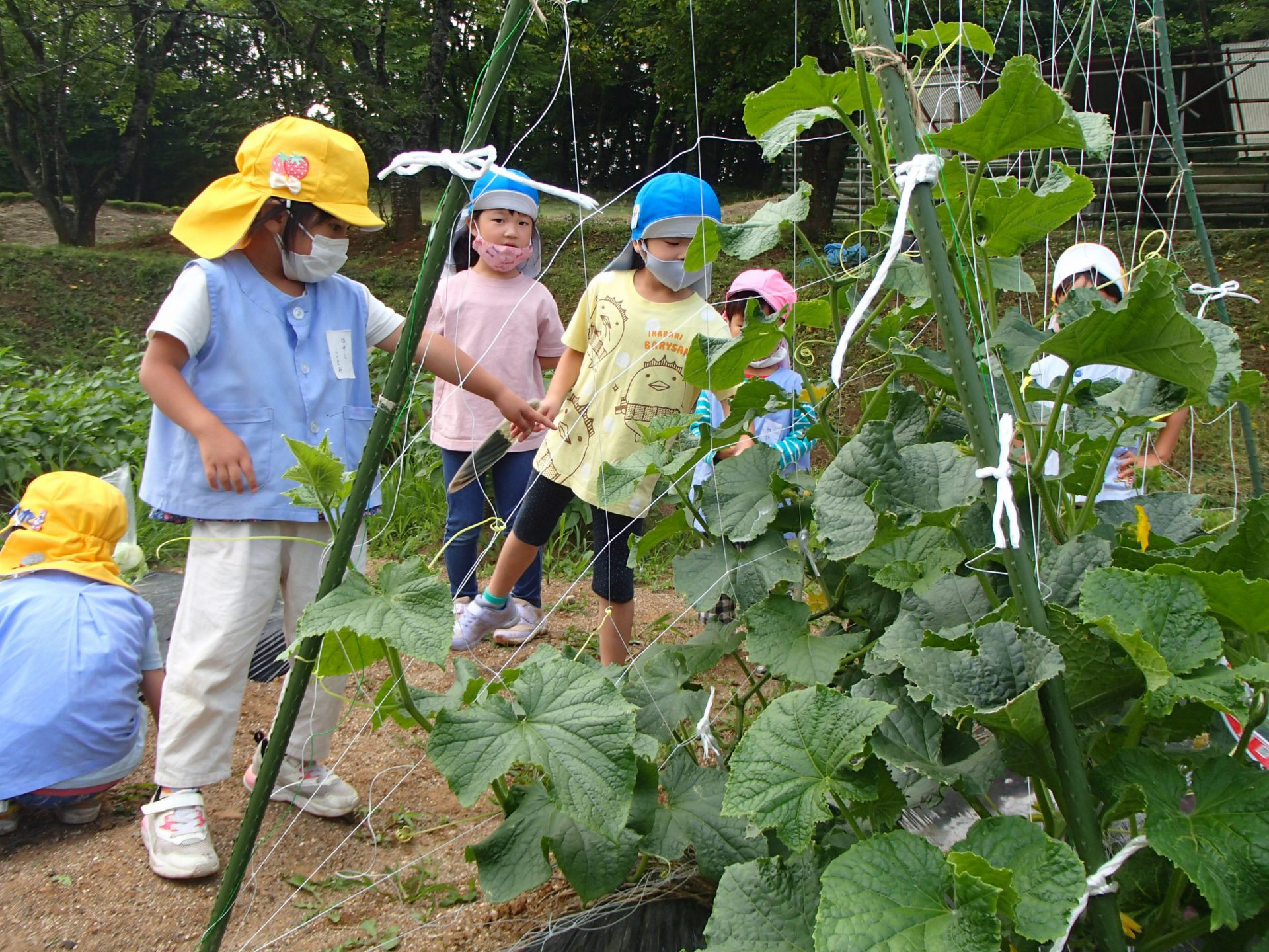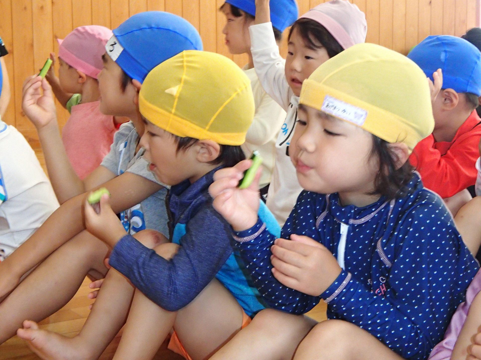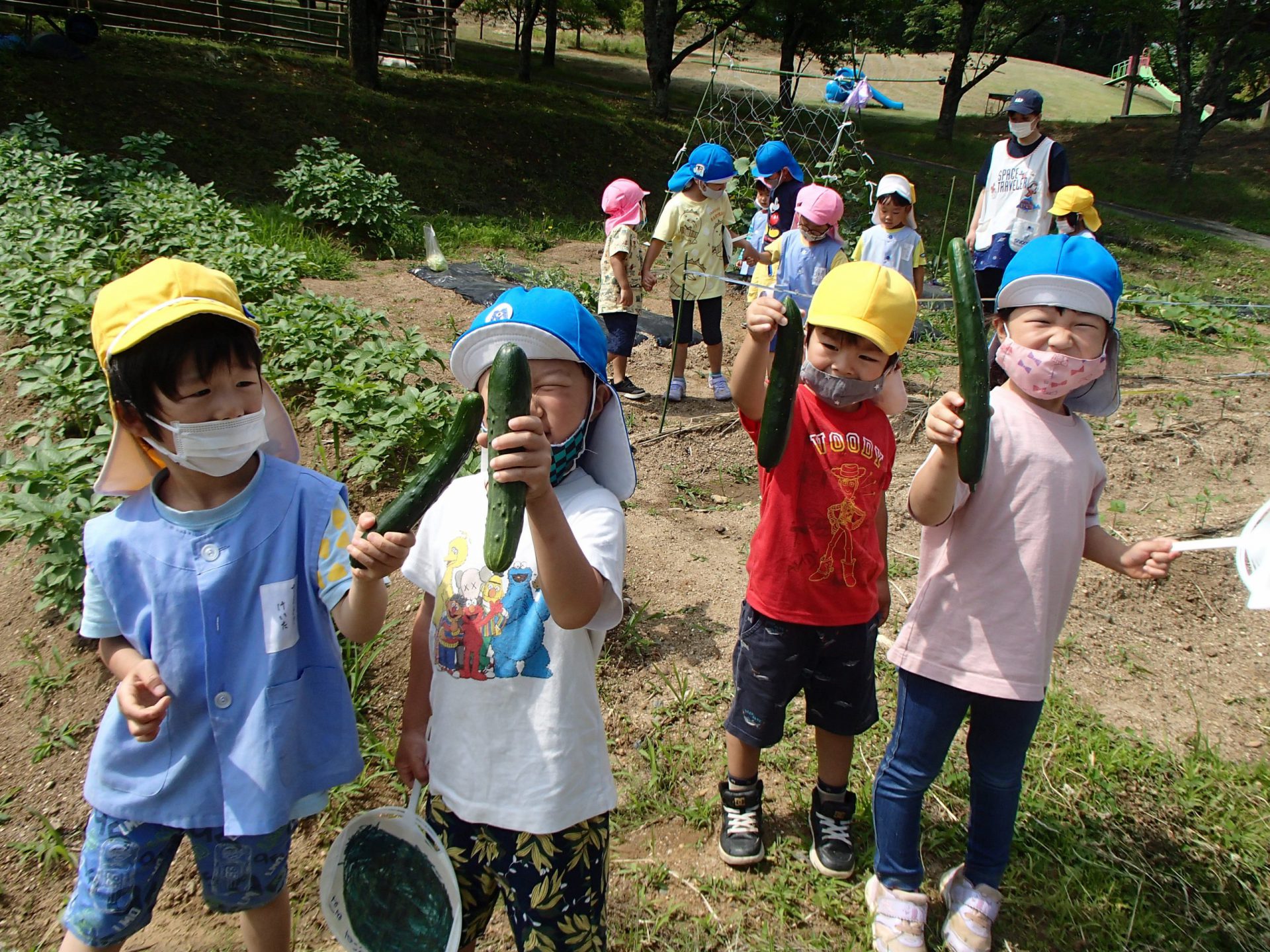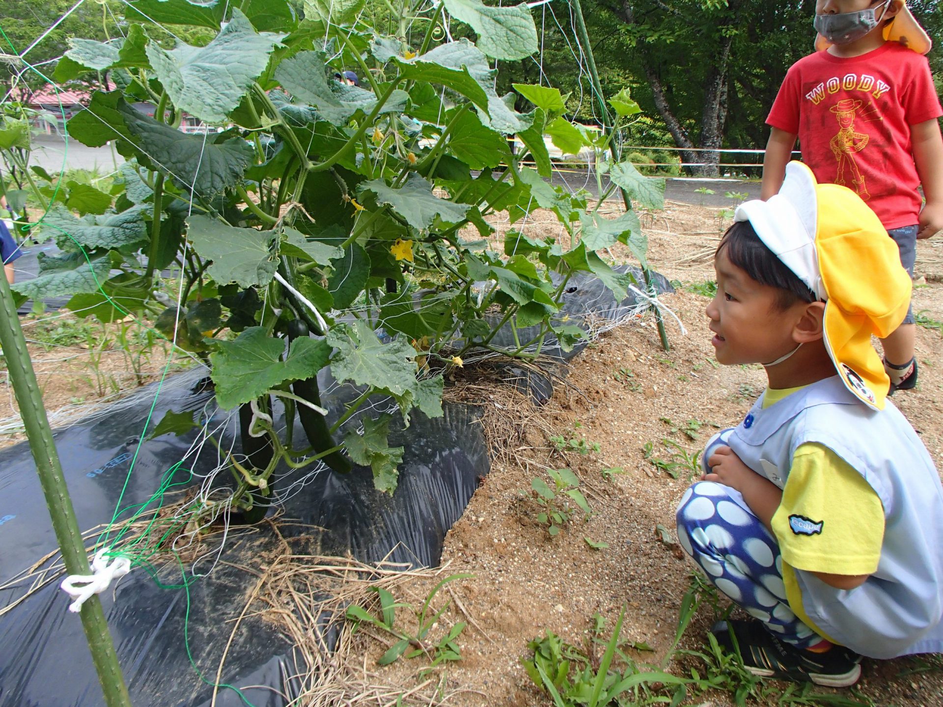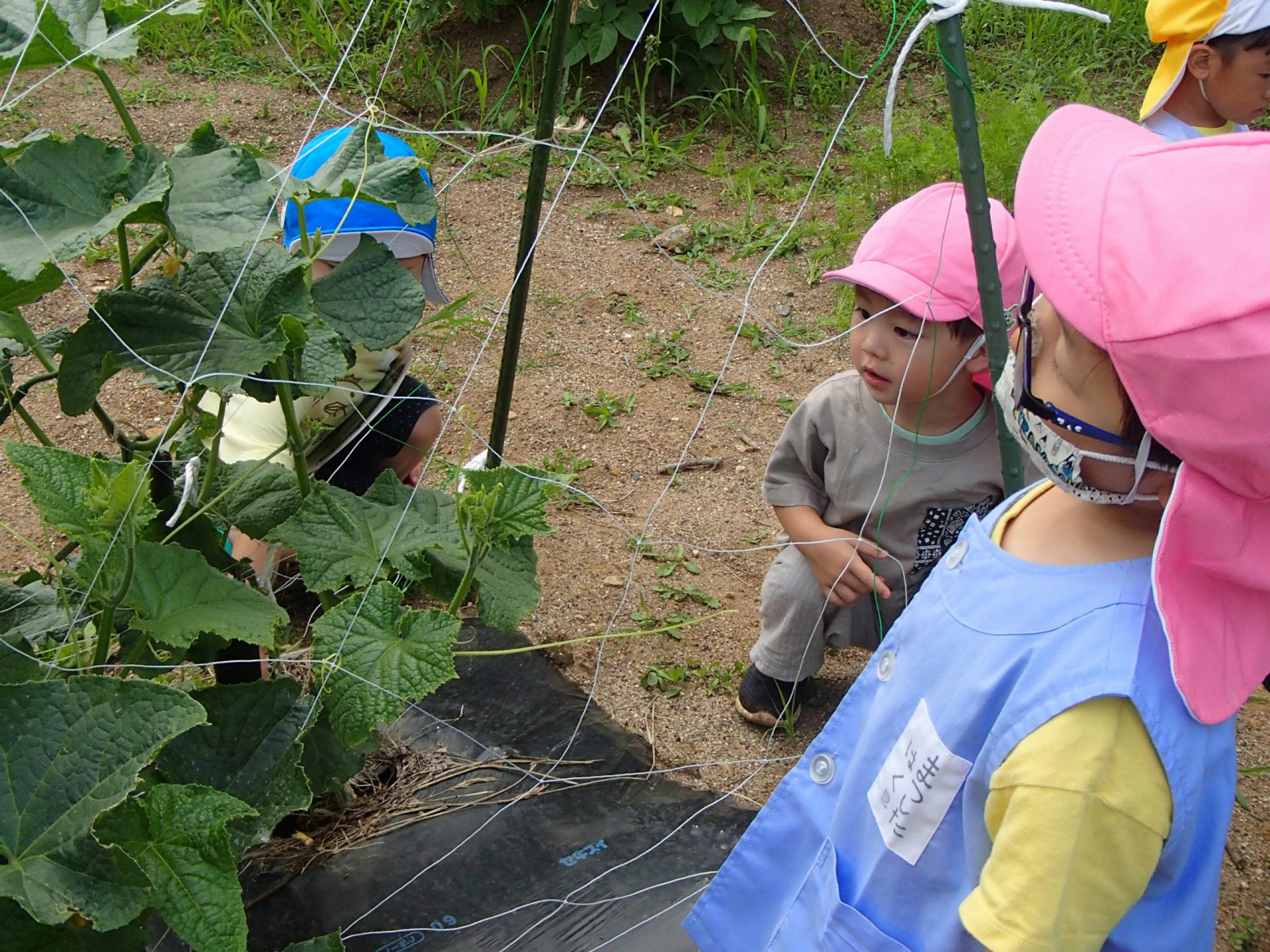 いろいろな野菜を植えてある保育園の畑です。久しぶりに年長の隊長さん先頭に畑に行ったら、大きなきゅうりがなっていてびっくり!他の野菜たちも生長している様子を見ながら、4本収穫できたので、プール開きのお祝いにみんなでいただきました。