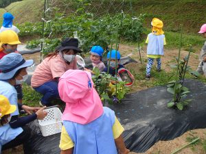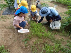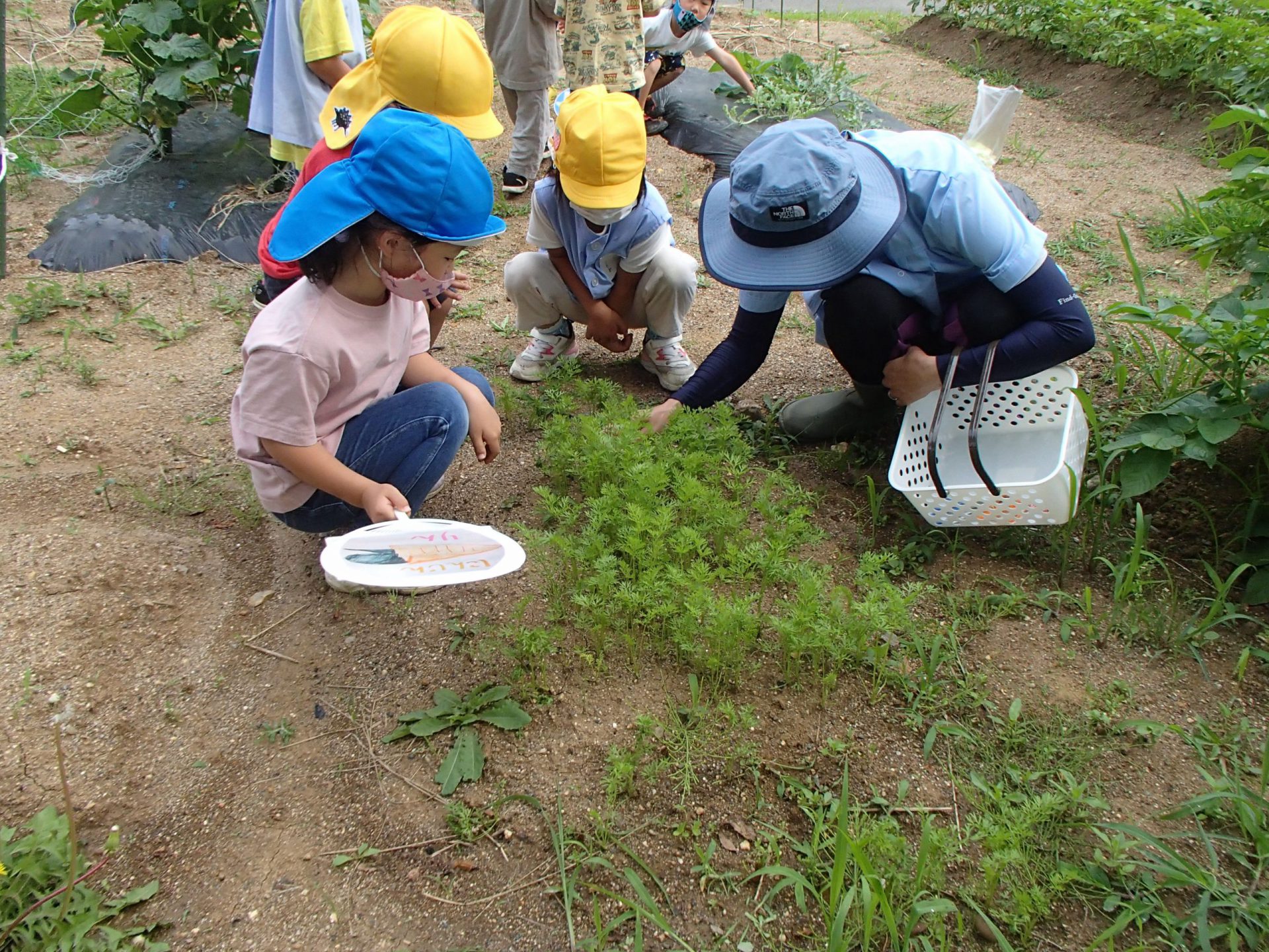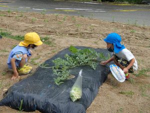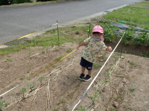 ・年長さんがお野菜の育成体調になってくれていて、小さいお友だちにも声をかけて畑の様子を見に行っています。行きたいお友だちがまず畑に行って様子を教えてくれ「じゃあ、明日は私も行ってみようかな。」と思えたらいいなぁと思って様子を見守っています。「畑?行きたい!待っとって!」と急いで靴を履く年少さんの様子も可愛いです。皆で野菜が大きくなる様子を見ながら気づいたことを伝え合っていきたいなと思います。