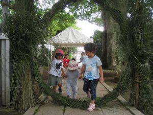 茅の輪とは、茅(かや)で作られた大きな輪っかのことです。この茅の輪をくぐることにより無病息災や厄除け、家内安全を願う行事が