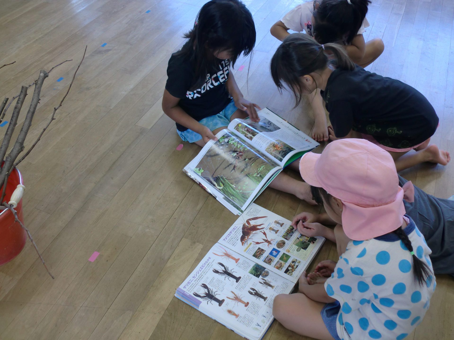 友達と助け合って、全員がザリガニを釣ることができました。