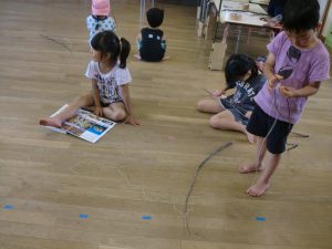 全員が初めての経験だったのですが、子ども達には自分で考えたり友だちと協力したりしてザリガニ釣りの準備をしてほしいと考えていました。子どもたちは図鑑で調べたり、自分の魚釣りなどの経験から考えたりしながら試行錯誤して作ったり、友だちと助け合って釣ったり、自分たちでやったんだという気持ちがあり、満足感のある活動だったようです。