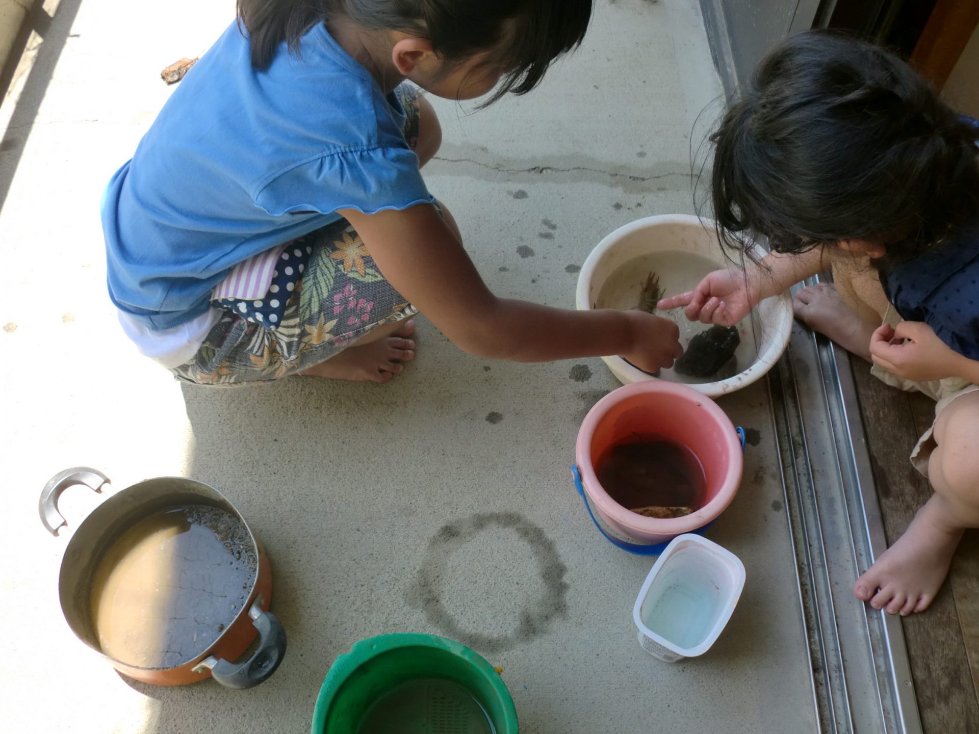 「私、全然つれないよ、、、」「こっち来て!そこにザリガニいるから、そーっとね」