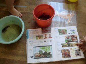 「あ!ザリガニの餌つけてないよ」