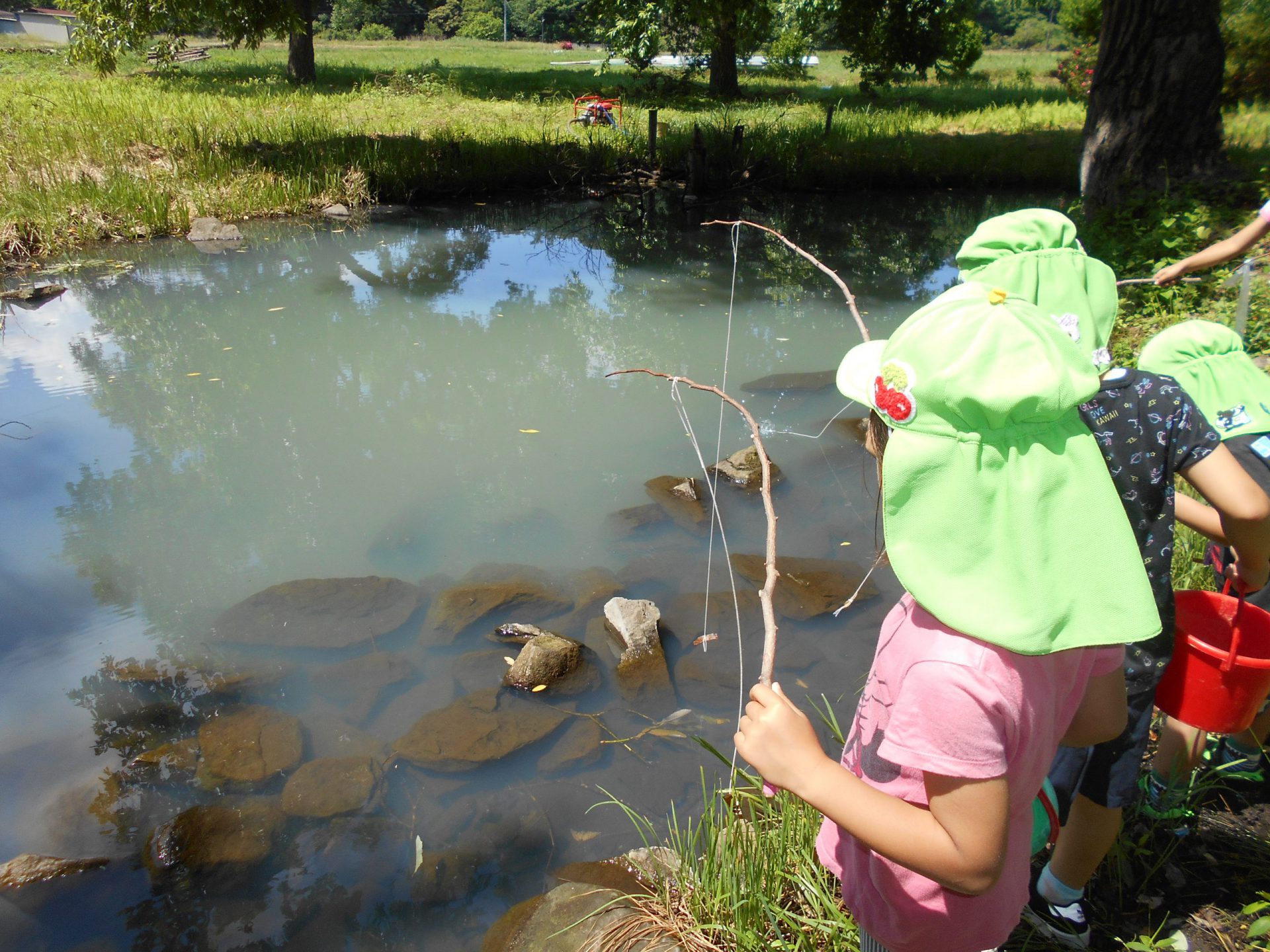 「ザリガニつれたよー」「ぼくがつったんだよ」「私もつれたよ」