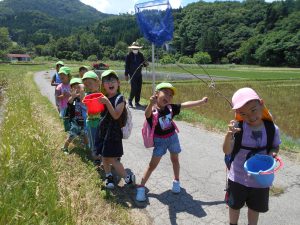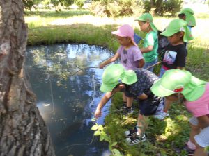 身近にいる生き物に興味を持っていて、園庭でも散歩先でも見つけたり、捕まえたり、観察したりしている姿が見られました。そこで、自分たちの住んでいる地域で様々な生き物に触れ、様々な経験をしてほしいと思い、以前から興味があったザリガニ釣りを計画しました。