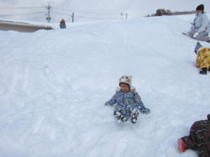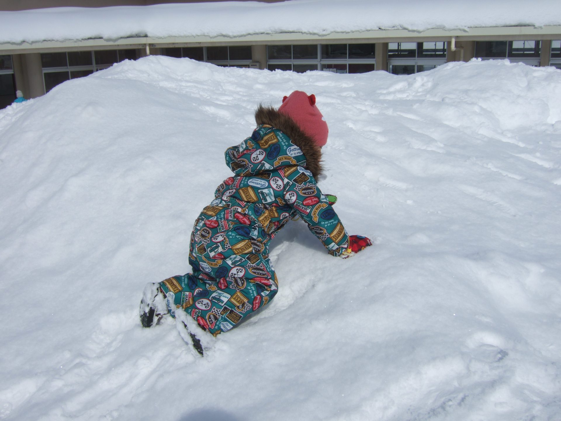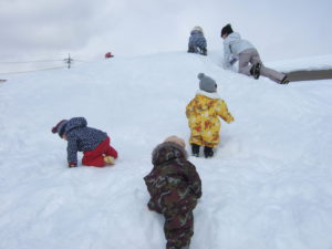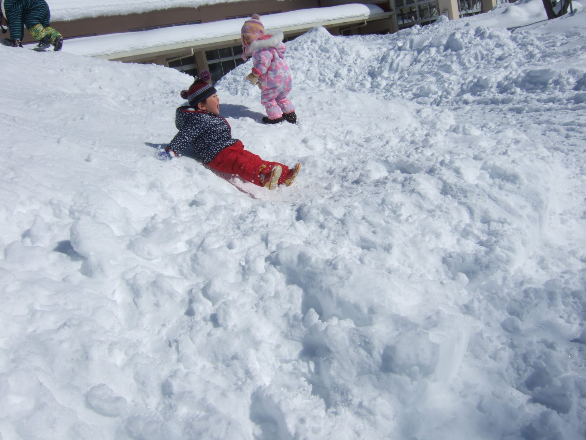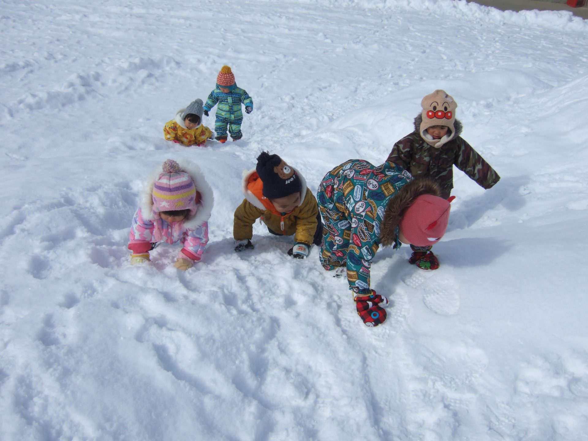 雪山に登るときは、保育士に支えられながら登っていた子ども達。雪遊びを楽しんでいくうちに、ちょっと難しいけど「自分で登りたい!」という気持ちが強くなりました。何度も経験する中で体の使い方がわかり最近では一人でも登れるようになりました。一人で登りきった時の笑顔、なんともいえない良い表情です!