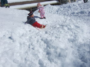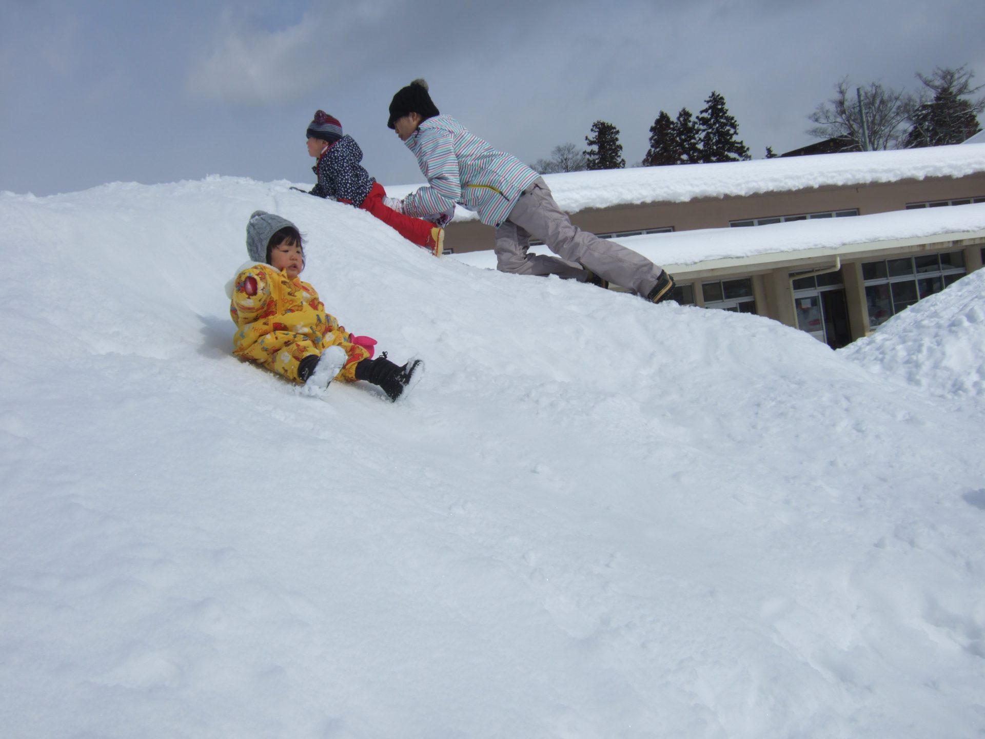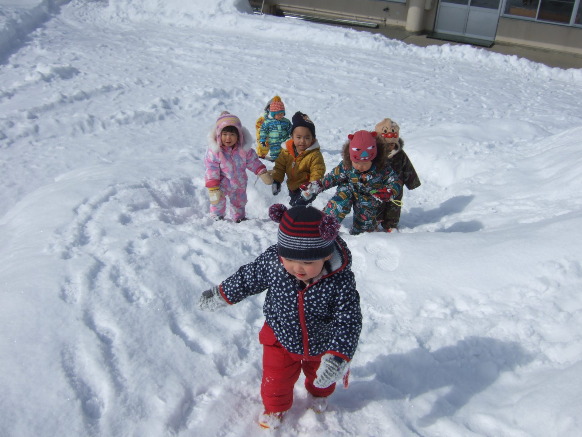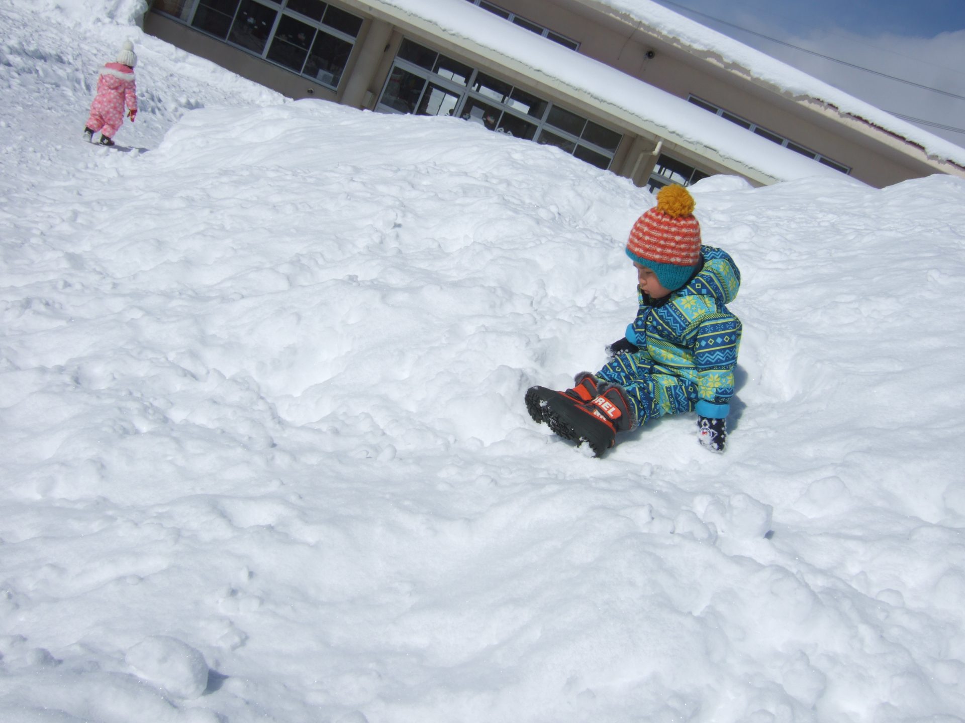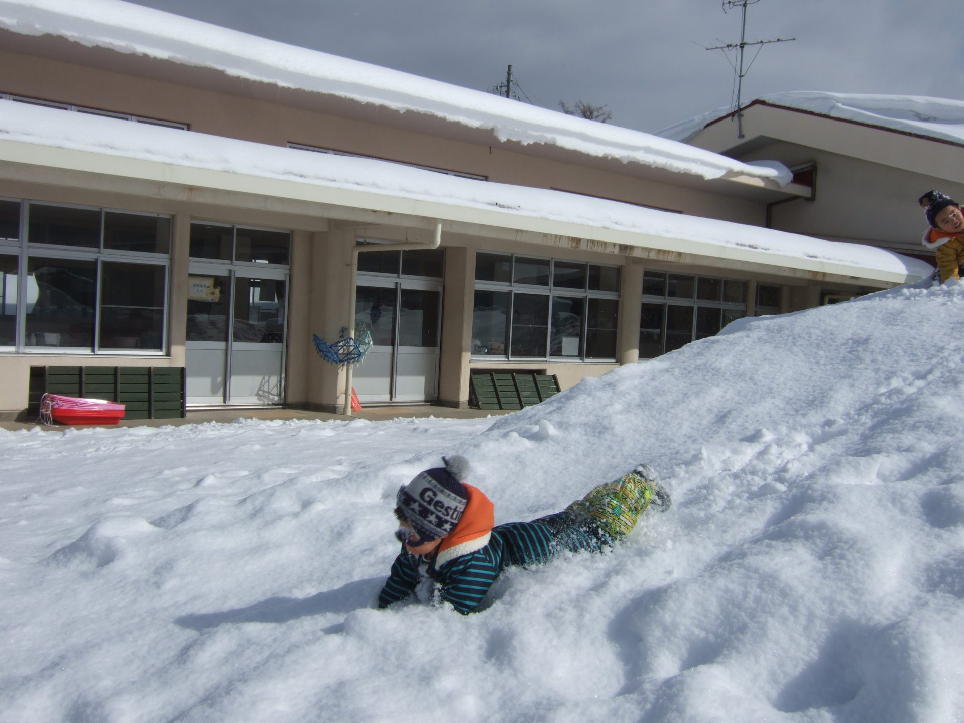 雪山に登るときは、保育士に支えられながら登っていた子ども達。雪遊びを楽しんでいくうちに、ちょっと難しいけど「自分で登りたい!」という気持ちが強くなりました。何度も経験する中で体の使い方がわかり最近では一人でも登れるようになりました。一人で登りきった時の笑顔、なんともいえない良い表情です!