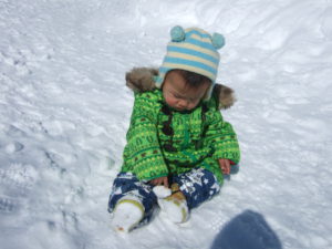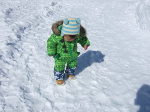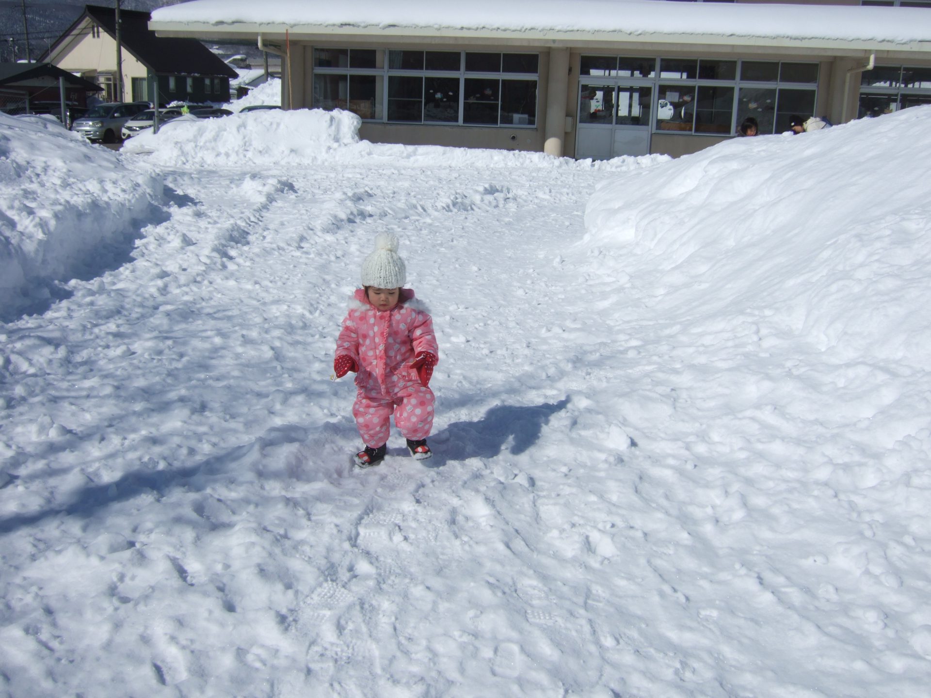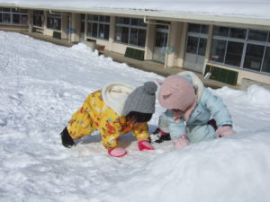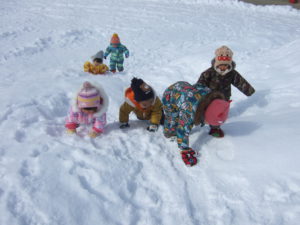 0歳児のお友達も、最初はでこぼこした雪の上は不安定で転んだり座り込んだり。ですが、だんだんと雪に慣れてきて、長い距離を歩いてみたり自分から雪に手を伸ばしたりと全身で雪を感じながら遊んでいます。