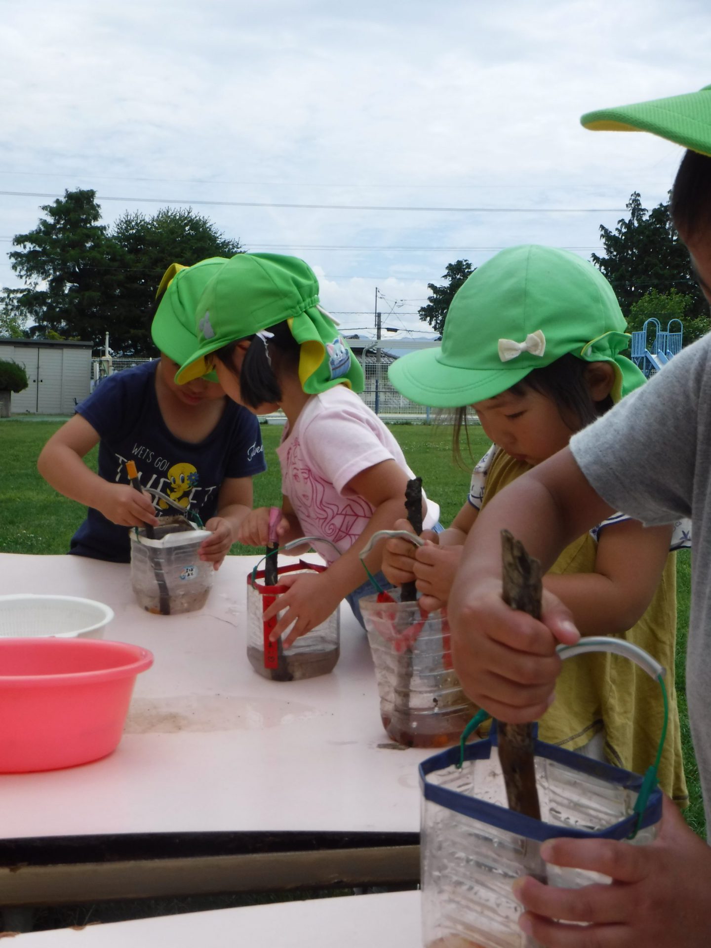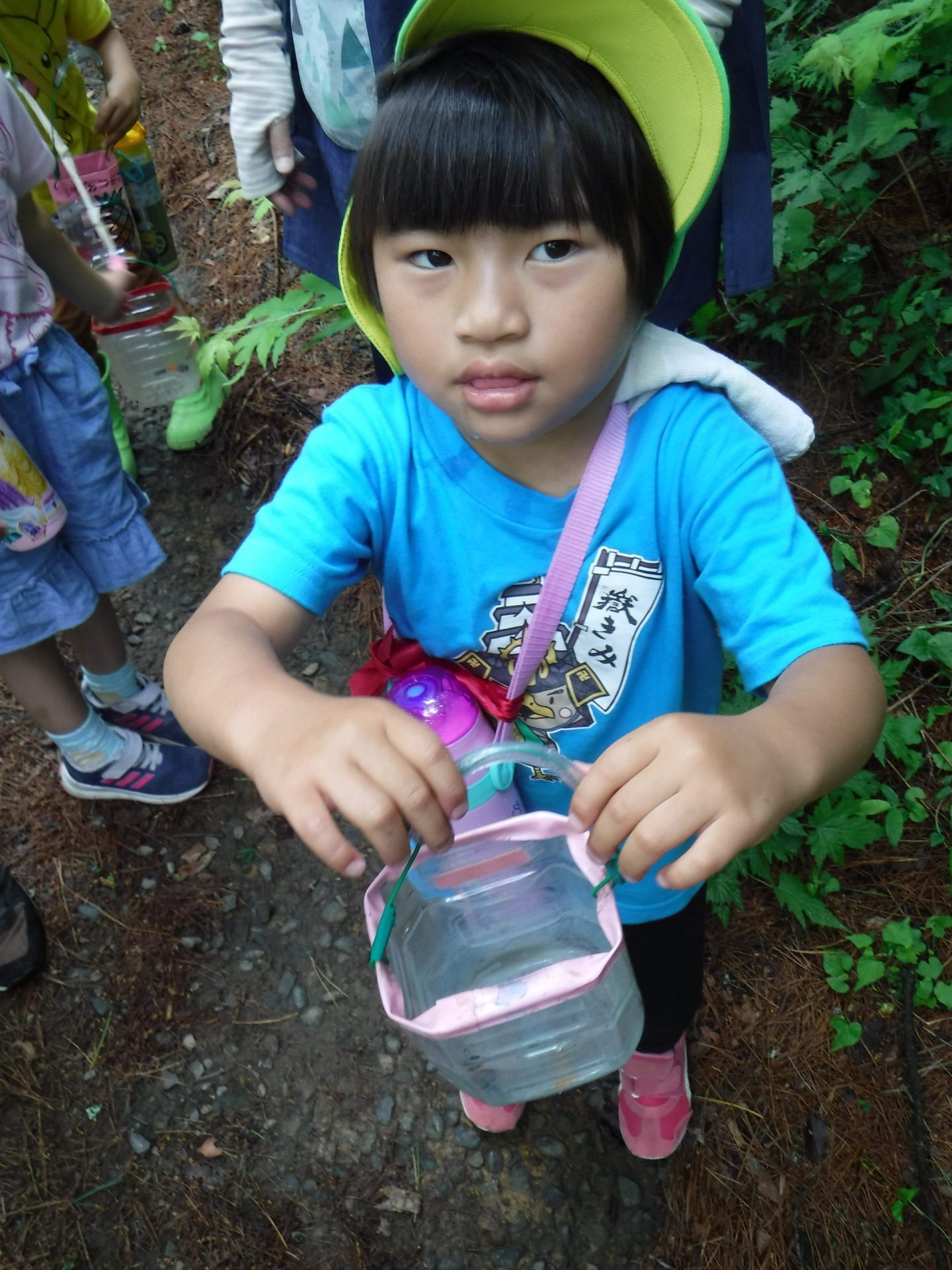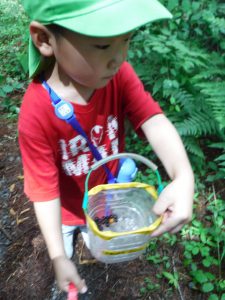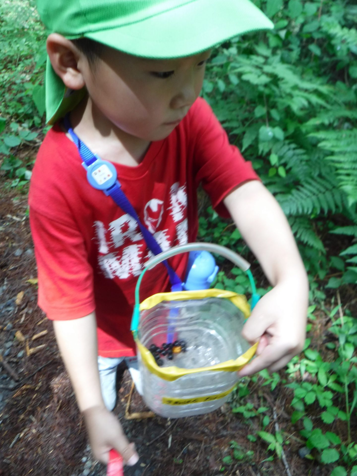 水筒とペットボトルのばけつを持って、木いちごが採れたらいれようね。
