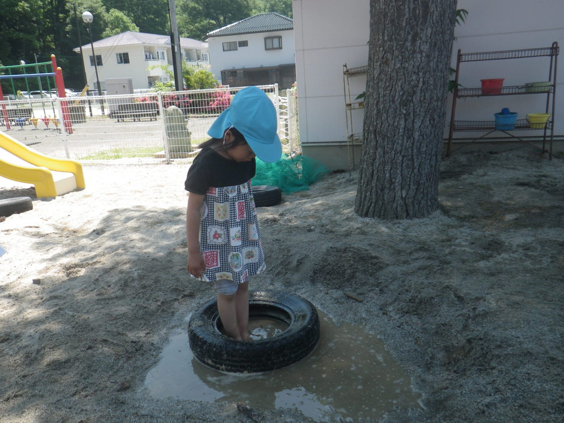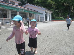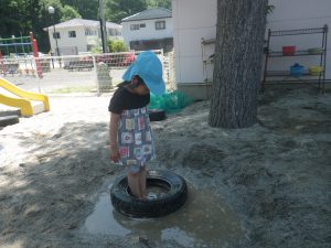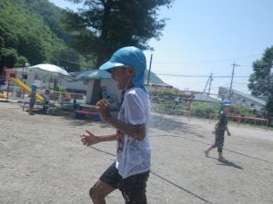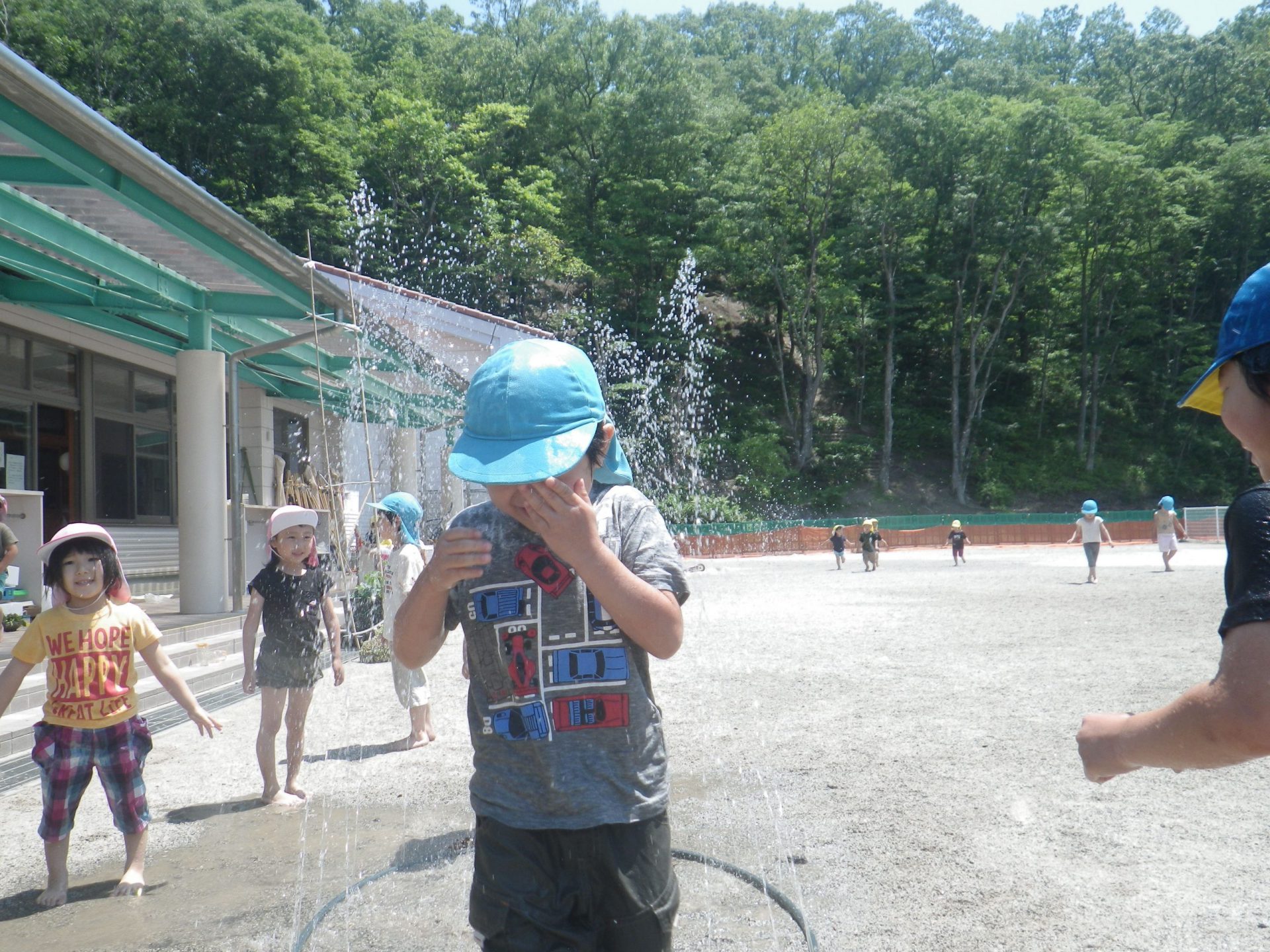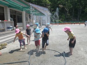 シャワーや噴水あそびにも参加します。水あそびが大好きな子ども達です。