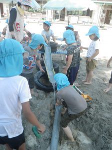 砂場には、さっそく子ども達が集まりパイプをつなげ始めます。