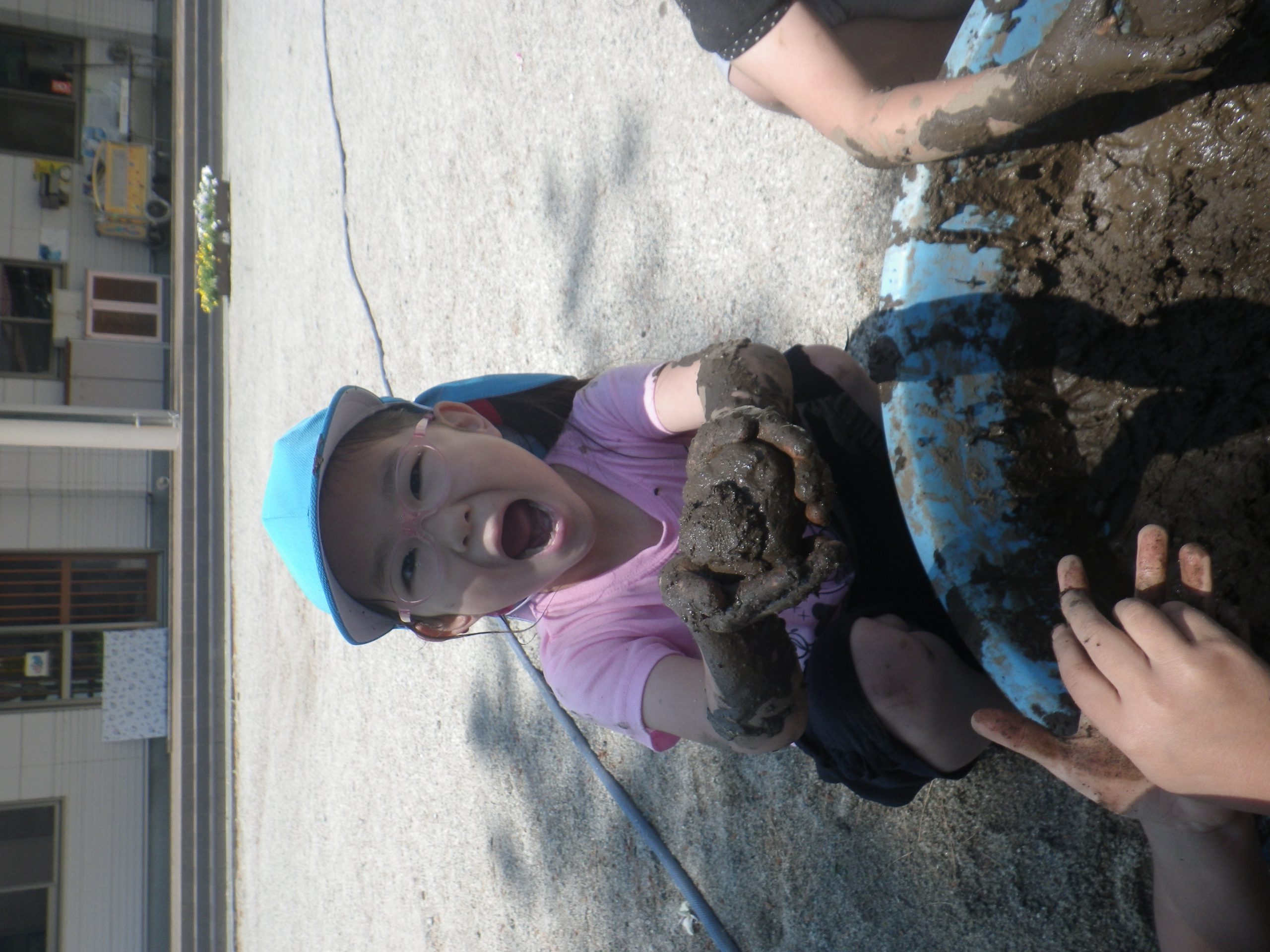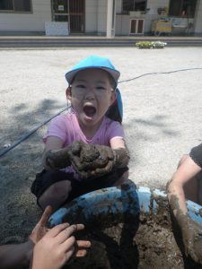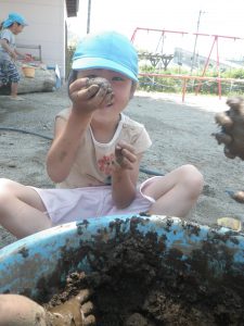 近くでは、年長の女の子が泥あそびを楽しんでいます。