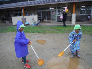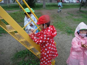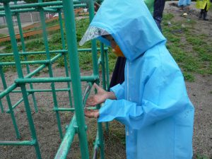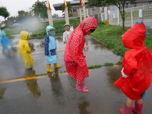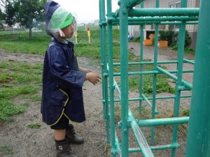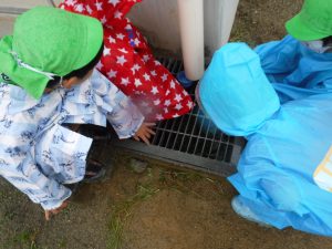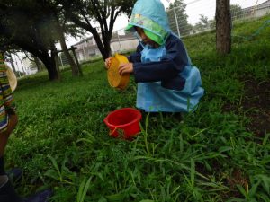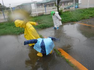 カッパを着て園庭へ出るとずっとやってみたかったことをやってみたり、新たな発見があったりとても楽しそうな姿があちこちで見られました。雨の日でしか経験できない発見をたくさんしていた子ども達の表情はきらきら輝いていました。