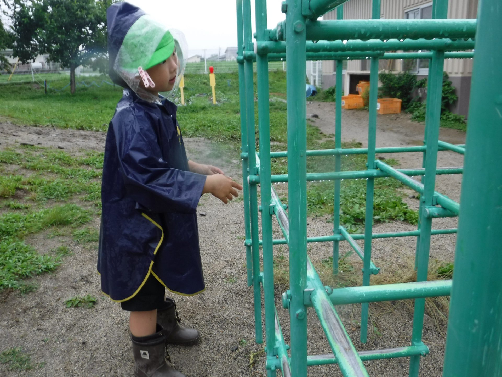 「わぁーい!」お気に入りのカッパを着て雨の中を園庭探検に出かけました。