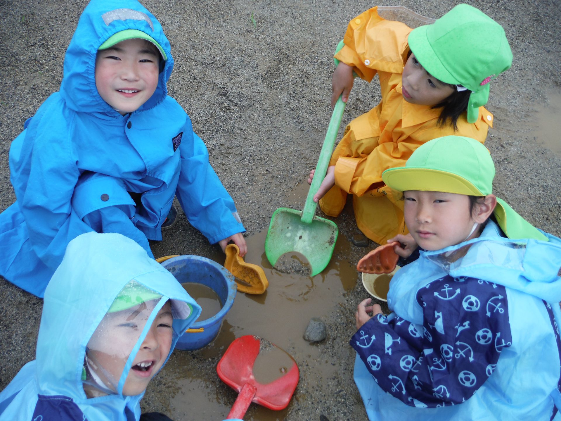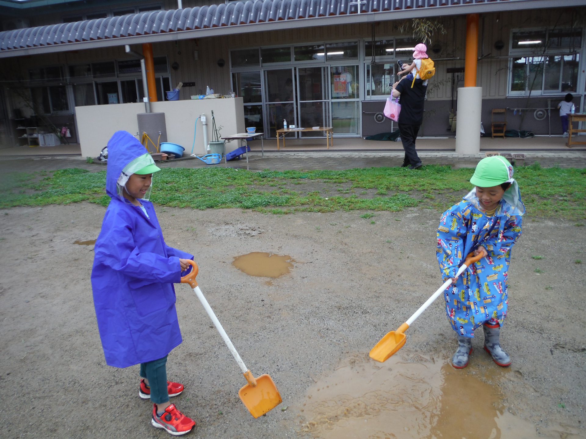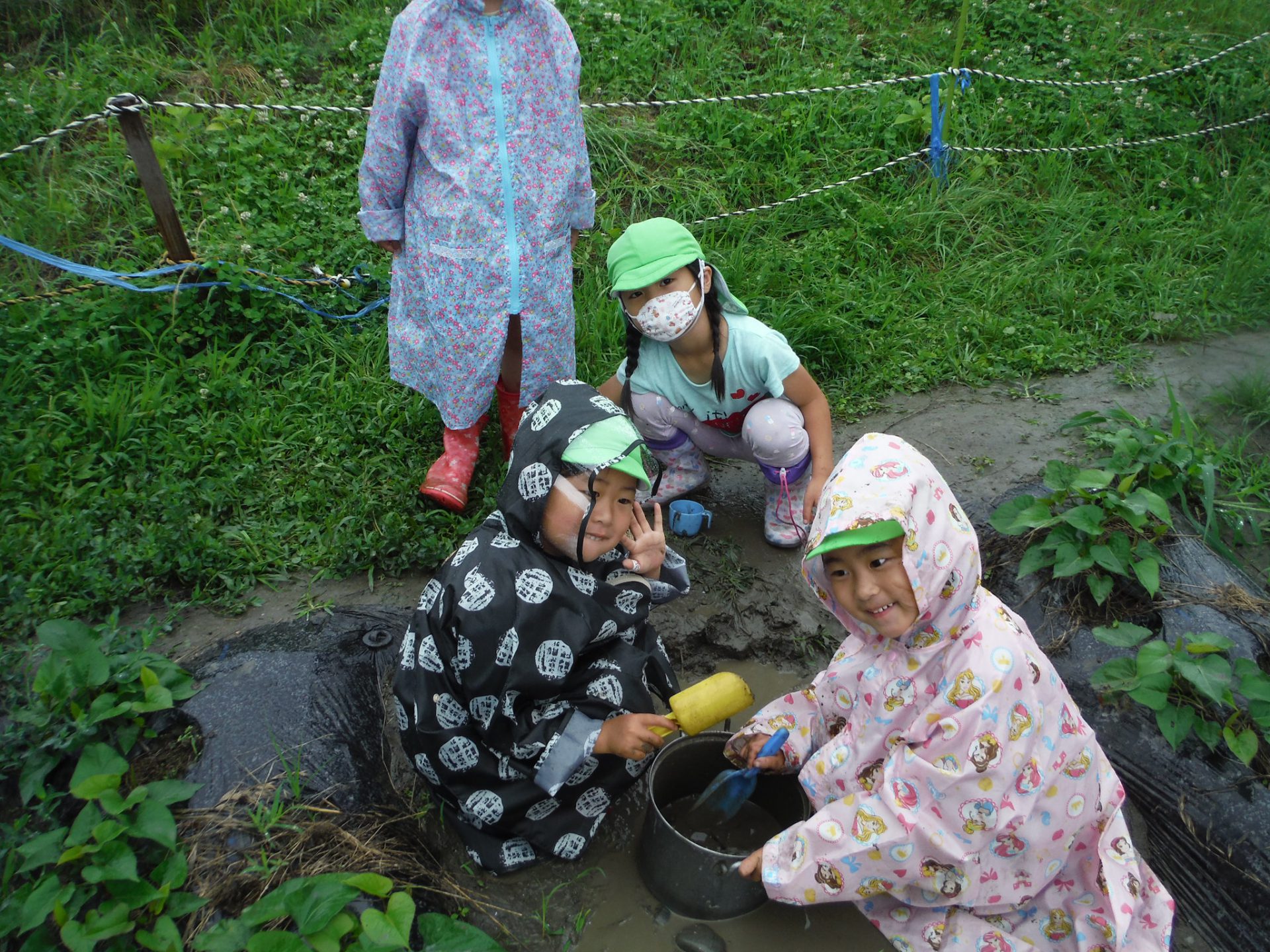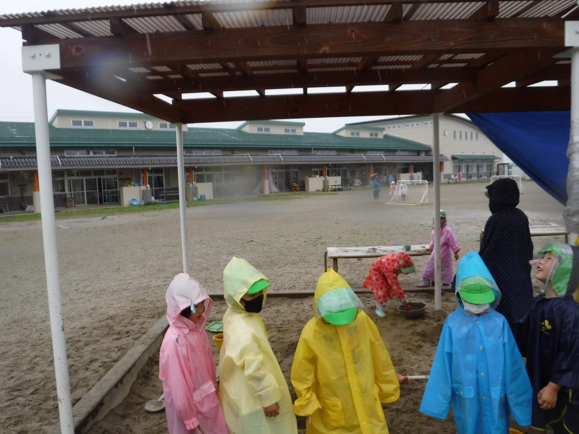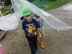 「カッパ忘れちゃった・・」と落ち込む友だちに気付いて「カッパ忘れちゃったの?」「私たちが連れてってあげる」とビニールの屋根を作っていろいろなところに連れて行ってあげていました。