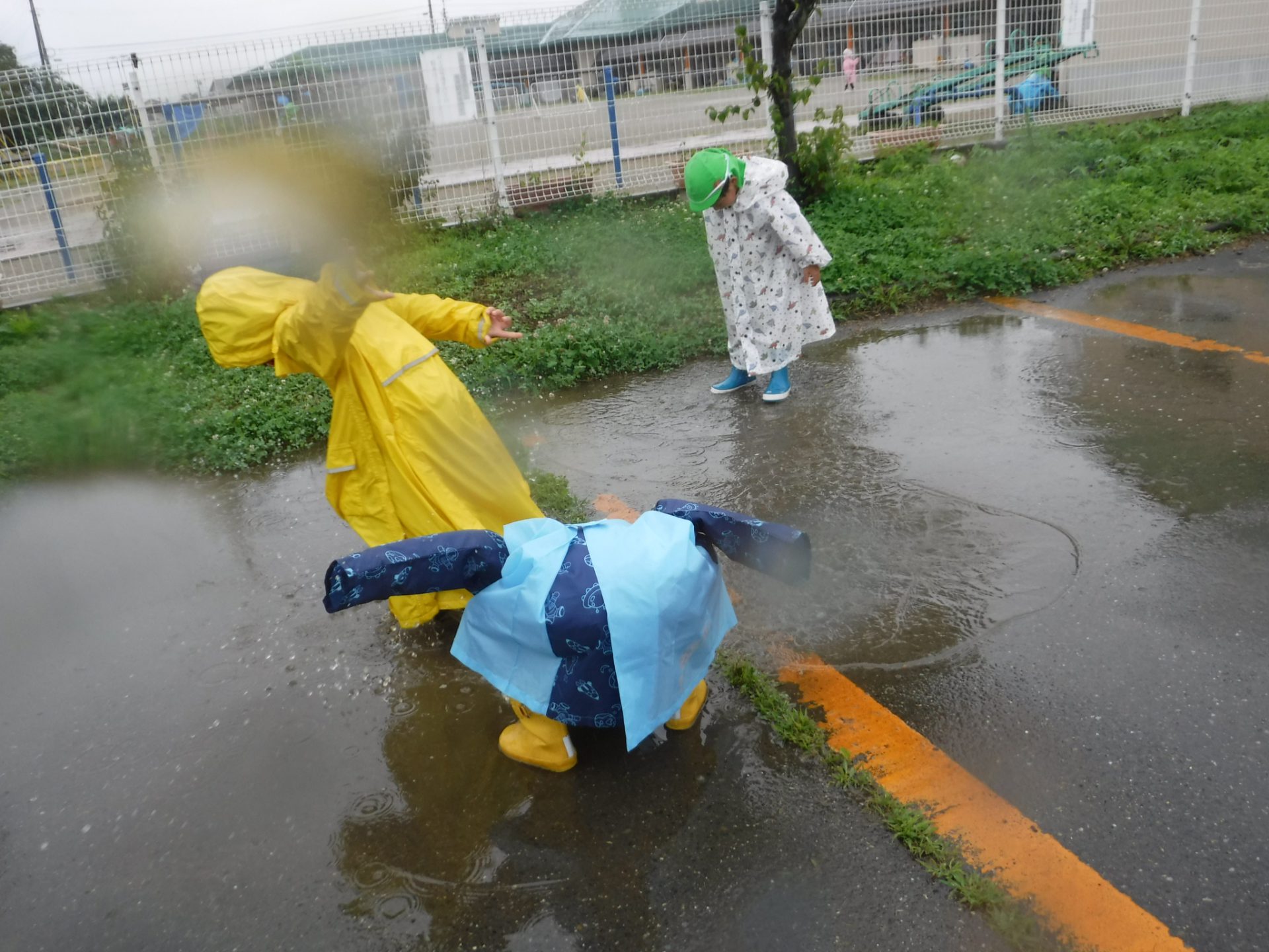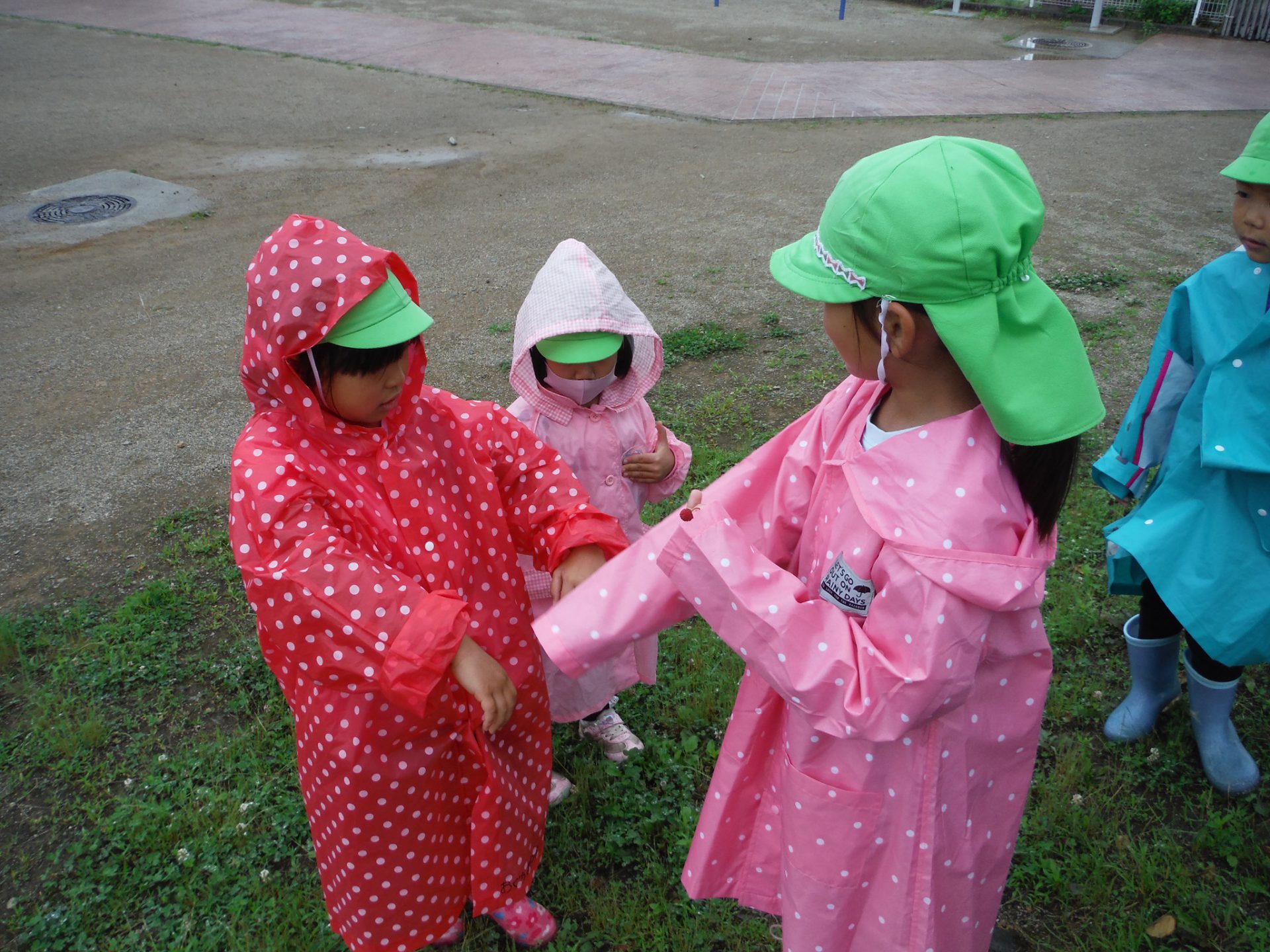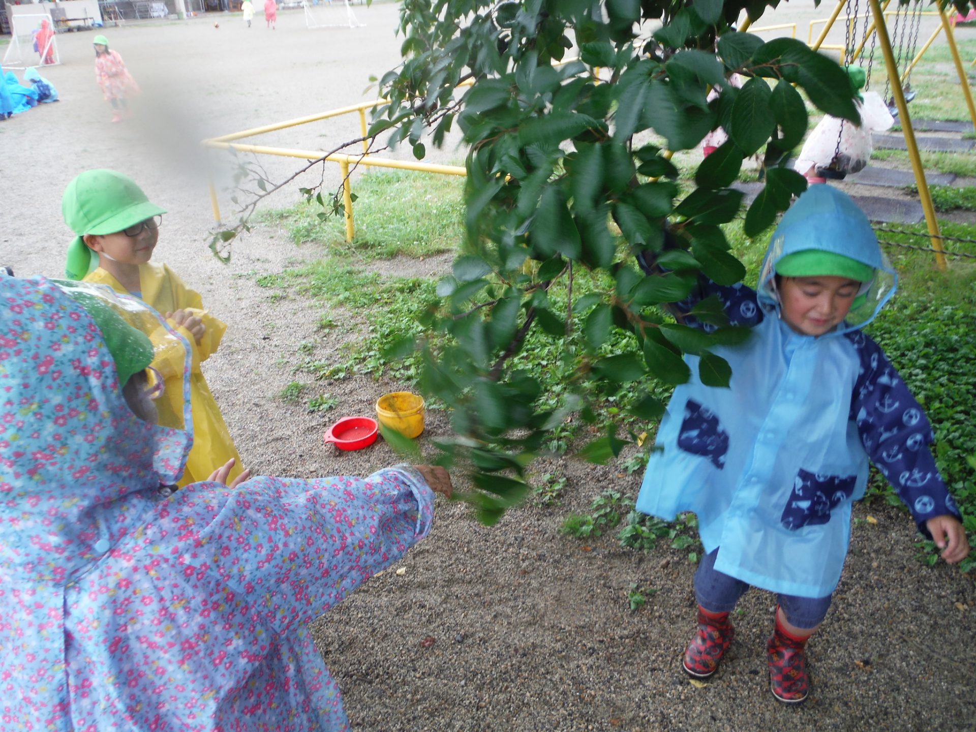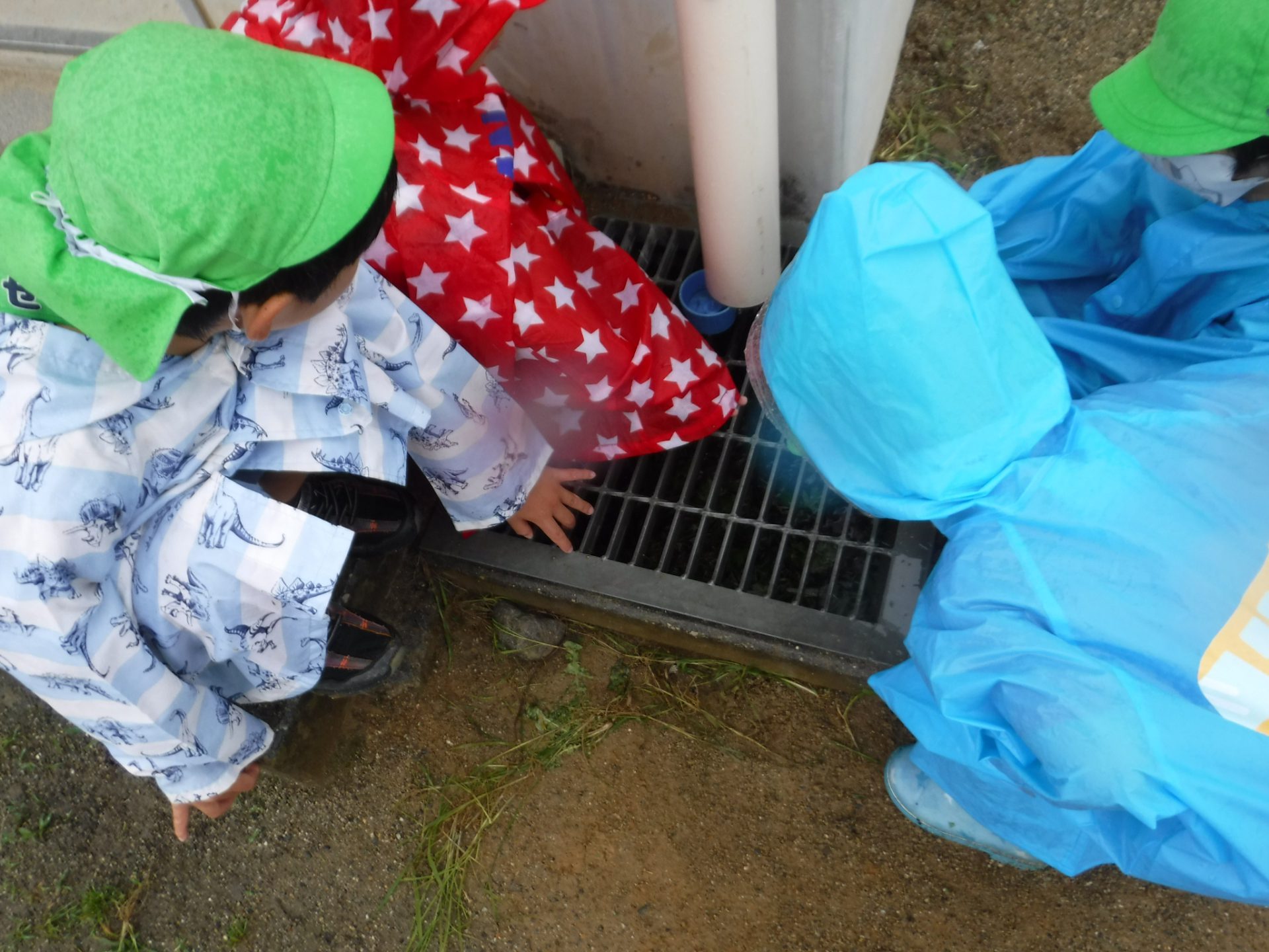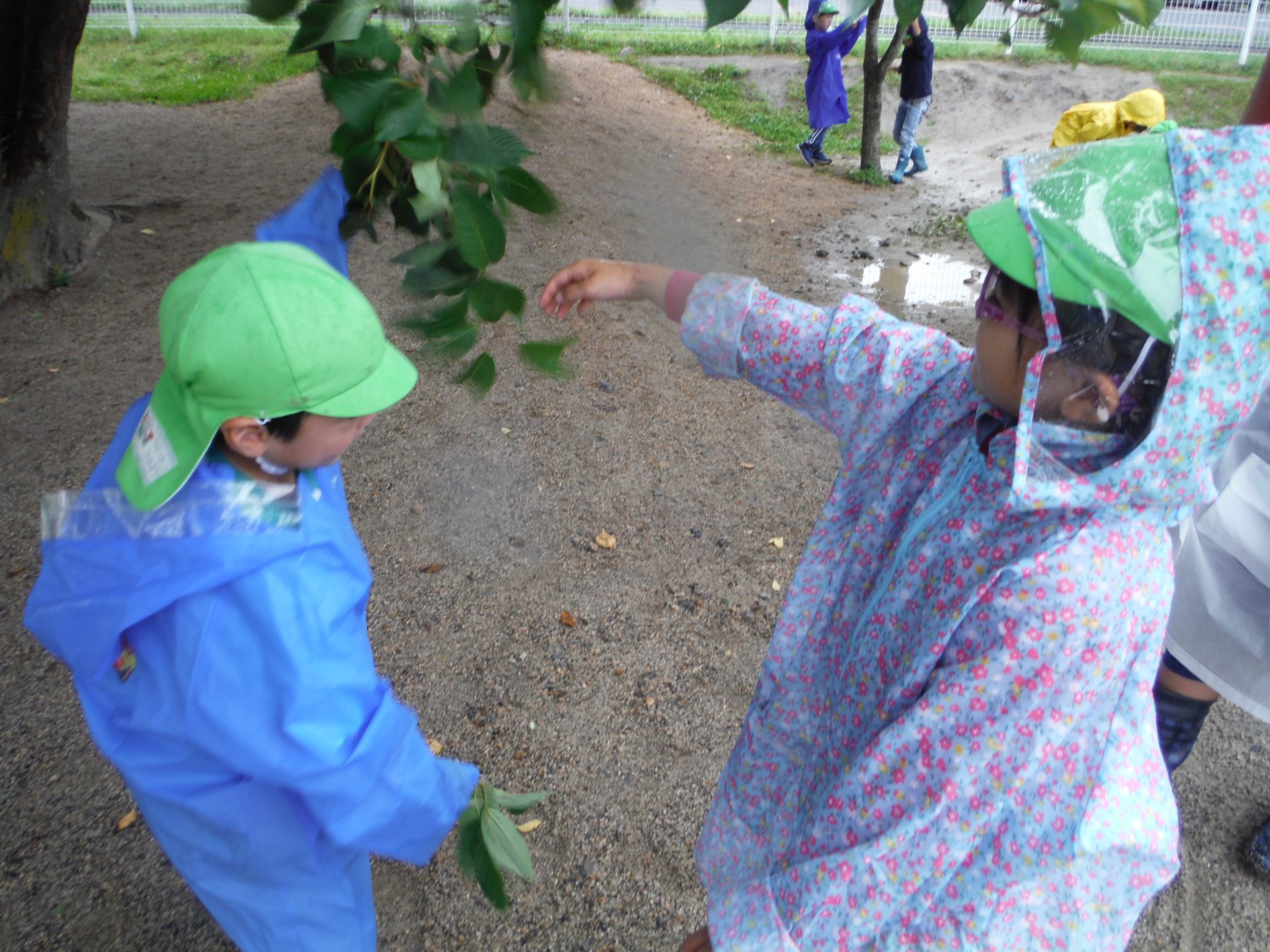 「カッパに雨が溜まってく!」カッパにあたった雨の感触を友達と楽しんでいました。