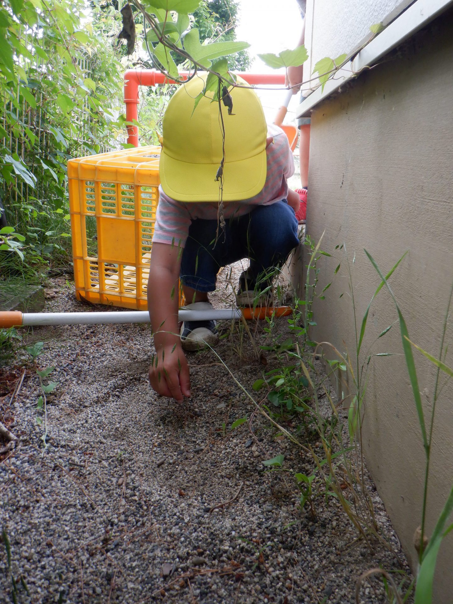 物置の裏の薄暗い場所にだんご虫がいることに気づいた子ども達。