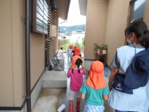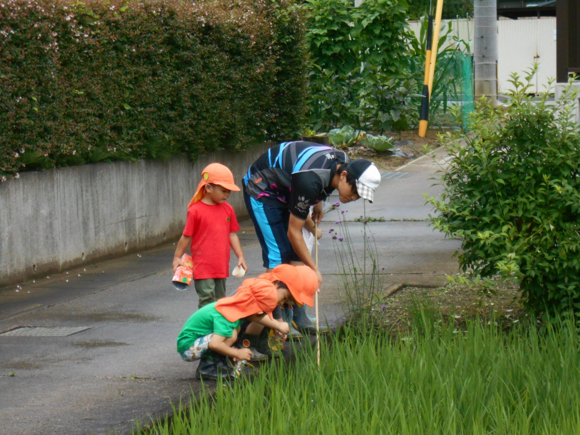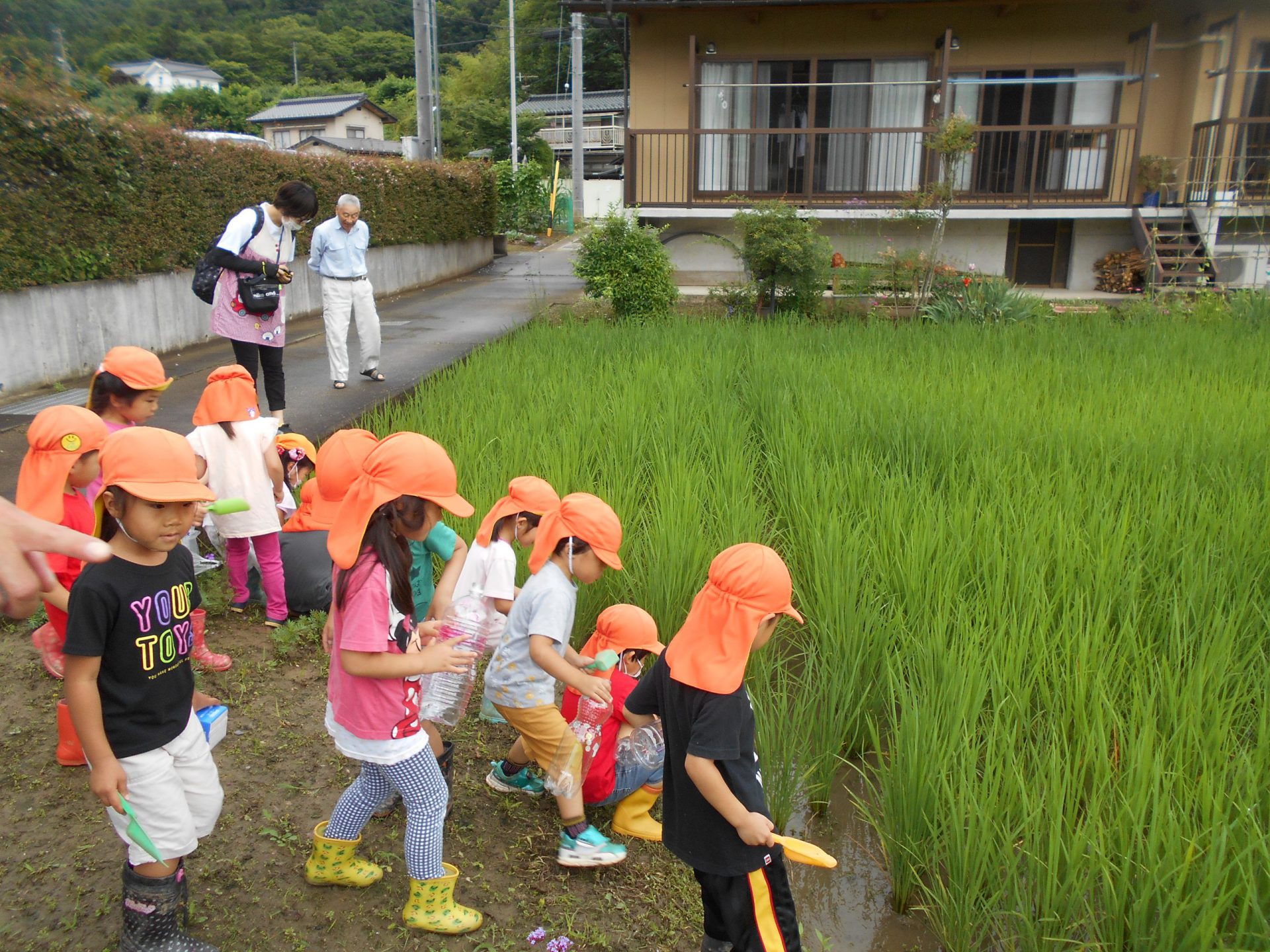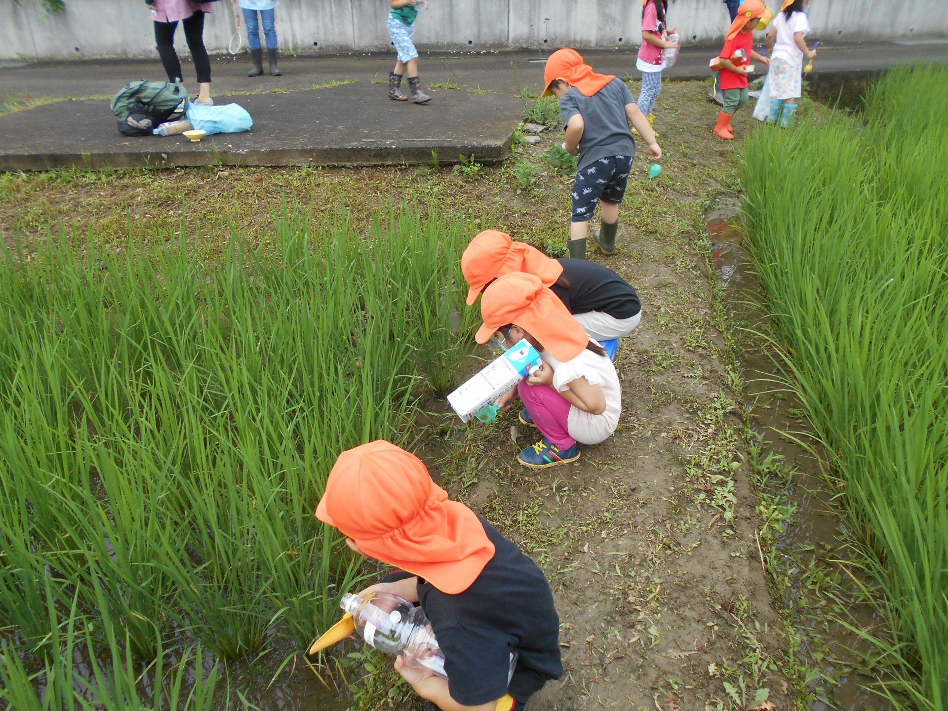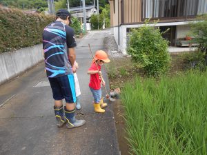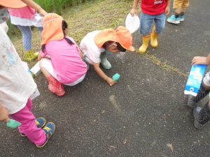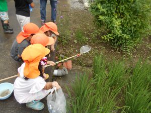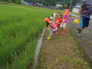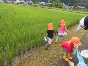子どもたちは様々な道具を持って捕まえられるか試しました。地域の方とも触れ合いたいという願いもあったため、田んぼの持ち主の方の家を訪ねました。「いいよ、いっぱい捕まえて」と言われて子どもたちは意気揚々でしたが、いざ捕まえようとするとオタマジャクシの逃げ足が速い!それでも自分なりのやり方で捕まえてみました。オタマジャクシは捕まらないとカエルならとカエルを追いかける姿もありました。持ち主の方はご夫婦で一緒に捕まえたり、見つけてくれたりして地域の方とのつながりもできました。
