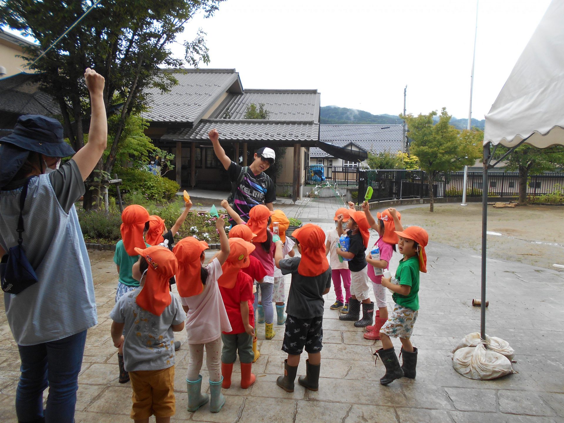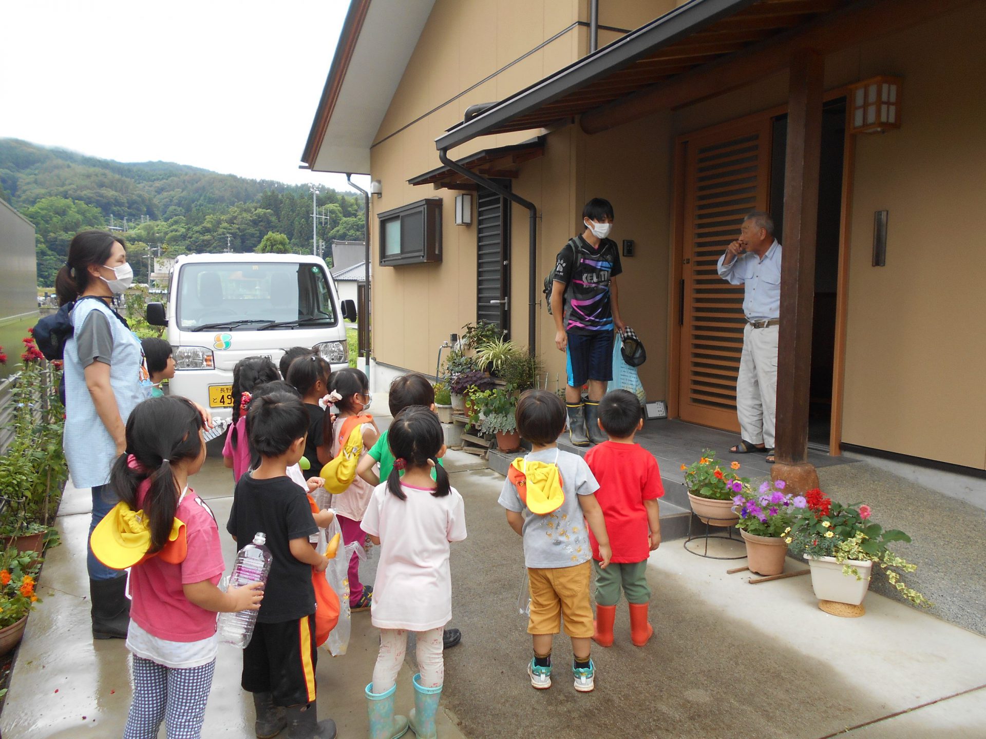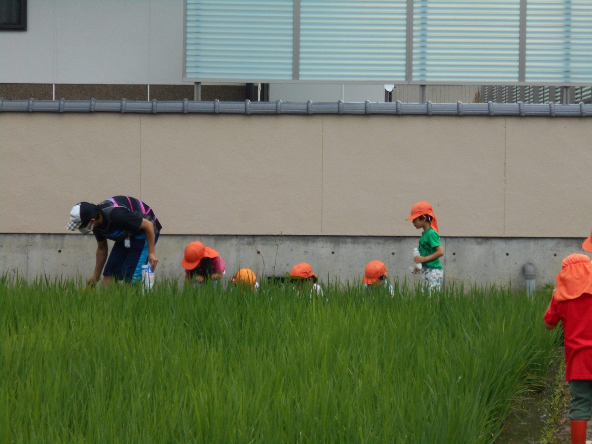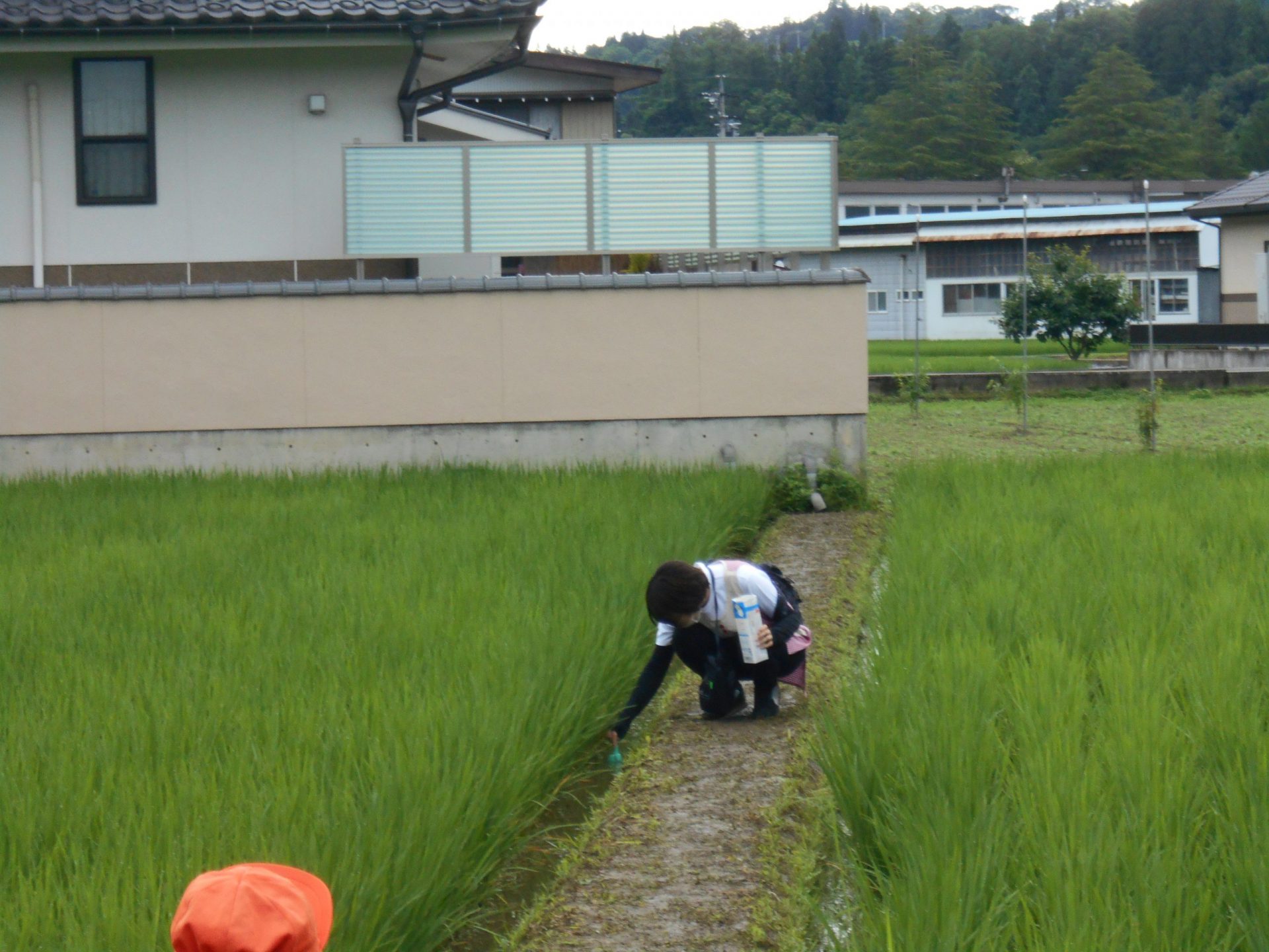 子どもたちは様々な道具を持って捕まえられるか試しました。地域の方とも触れ合いたいという願いもあったため、田んぼの持ち主の方の家を訪ねました。「いいよ、いっぱい捕まえて」と言われて子どもたちは意気揚々でしたが、いざ捕まえようとするとオタマジャクシの逃げ足が速い!それでも自分なりのやり方で捕まえてみました。オタマジャクシは捕まらないとカエルならとカエルを追いかける姿もありました。持ち主の方はご夫婦で一緒に捕まえたり、見つけてくれたりして地域の方とのつながりもできました。