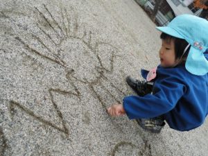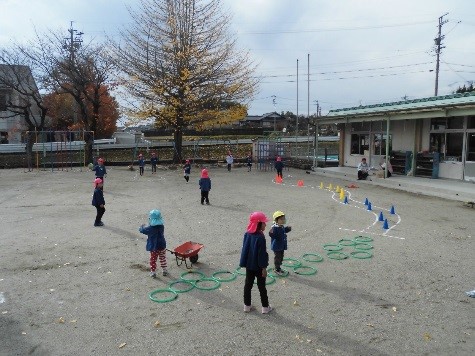 園庭には樹齢40年余の銀杏の木を始め、手の届く所に自然がたくさんあります。子ども達は思い思いの遊びを工夫し、秋から冬への季節の移り変わりを感じ取っていました。