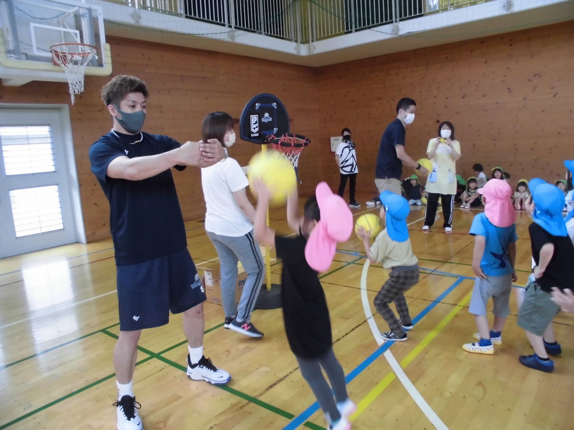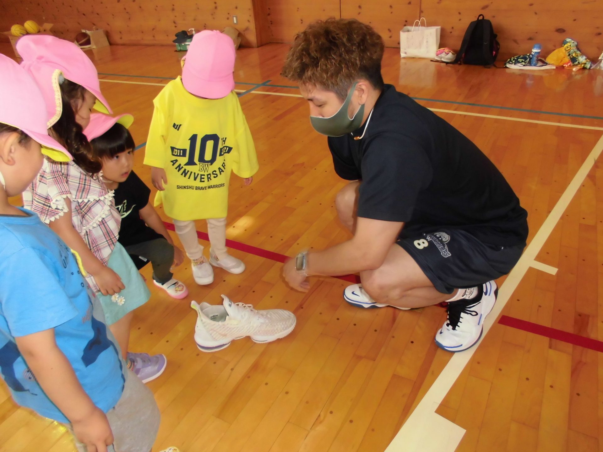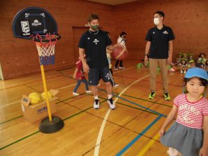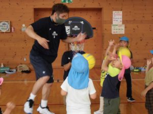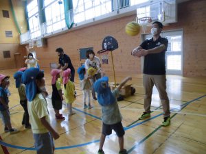 小学校の体育館をお借りして『信州ブレイブウォリアーズ(バスケット)』選手と交流をしました。