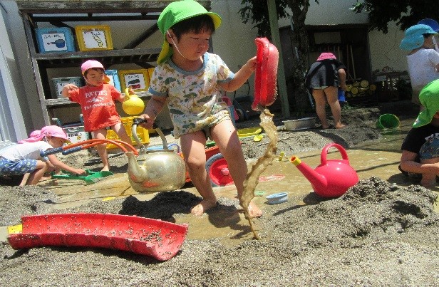 | 保育士が川を作る様子をみて「ぼくもやりたい!」「じゃあお水もってくるね!」 | ||||||