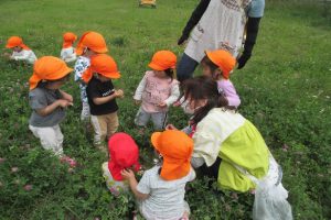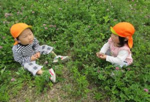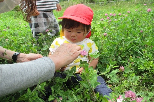 | ・草の上を歩く感覚、アカツメクサを見つけて蜜を吸ってみようとするなど | ||||||