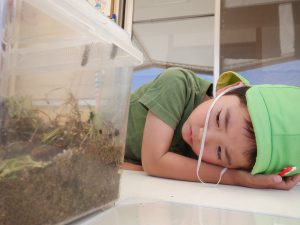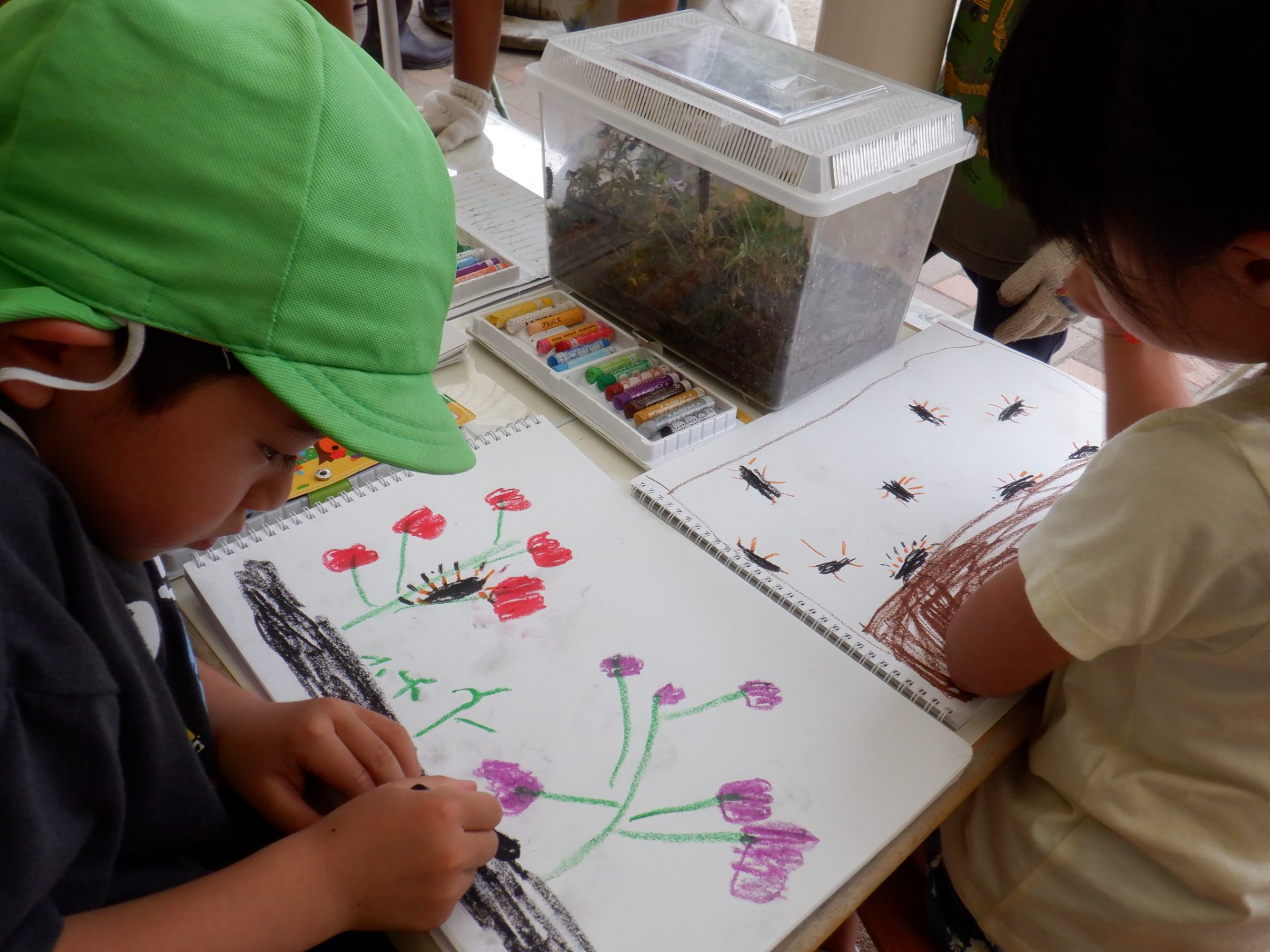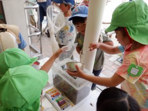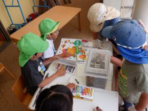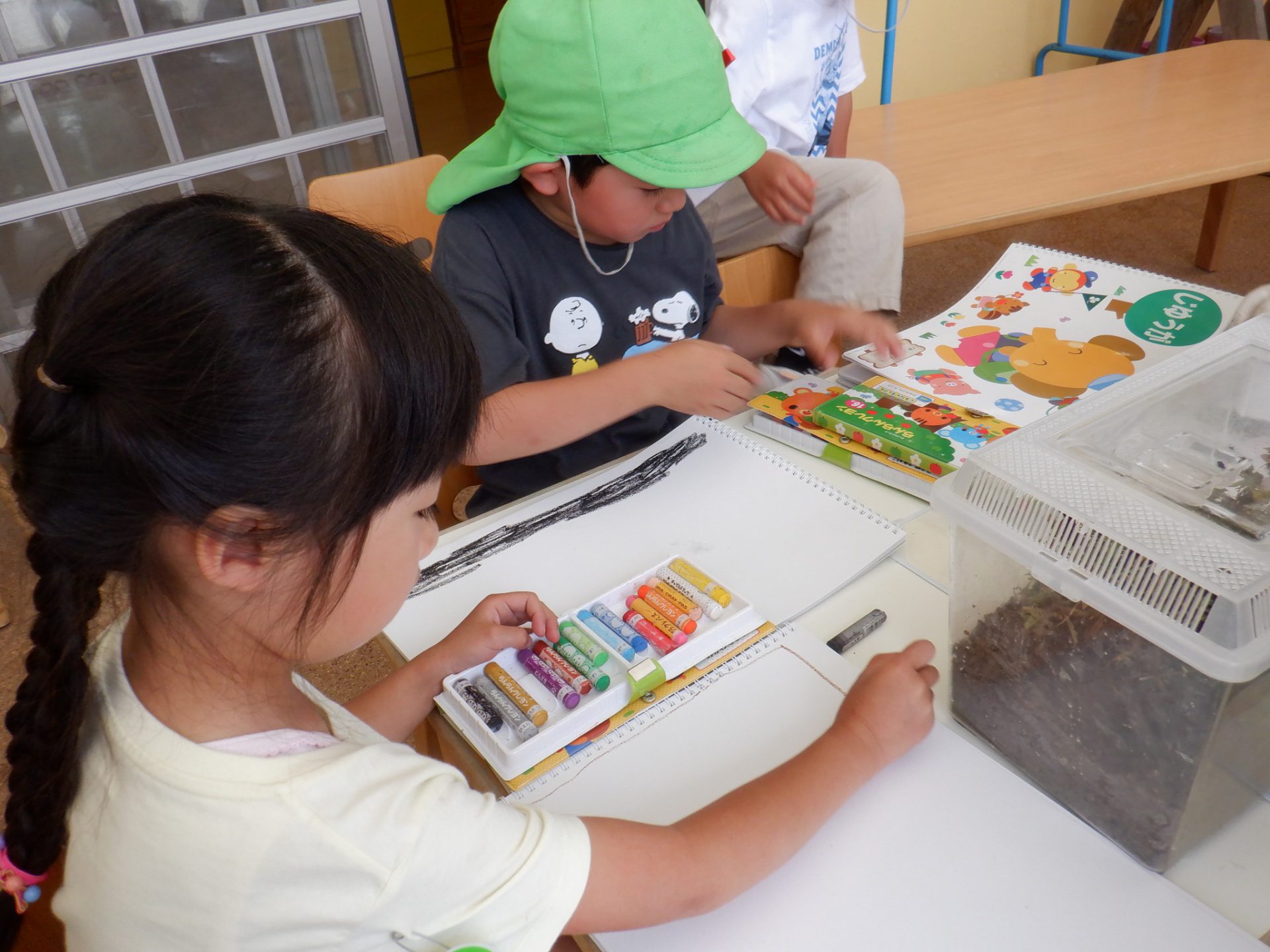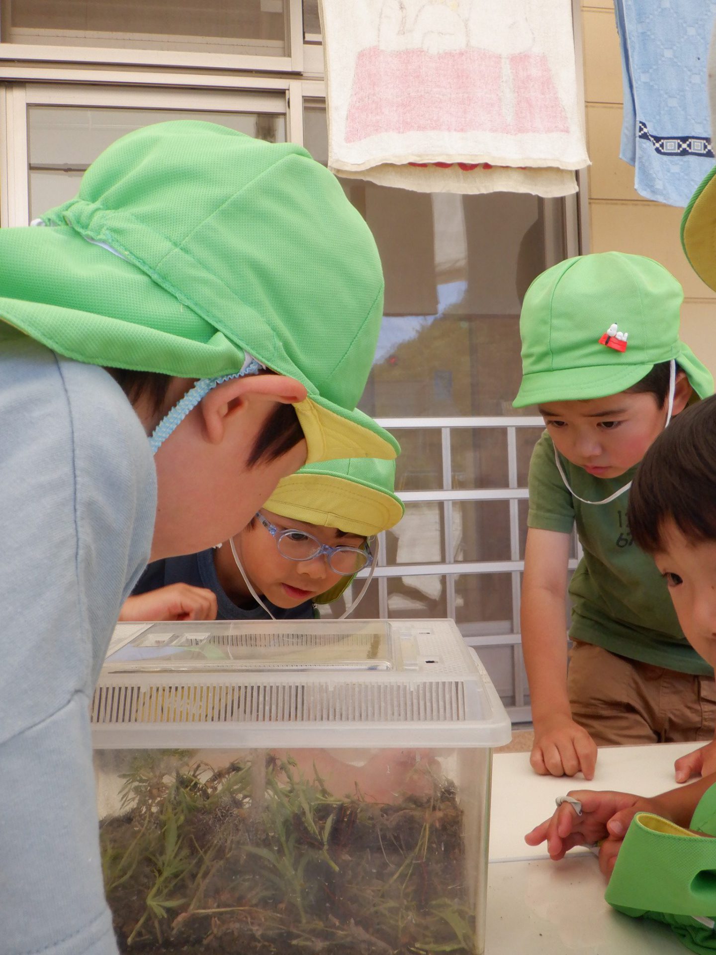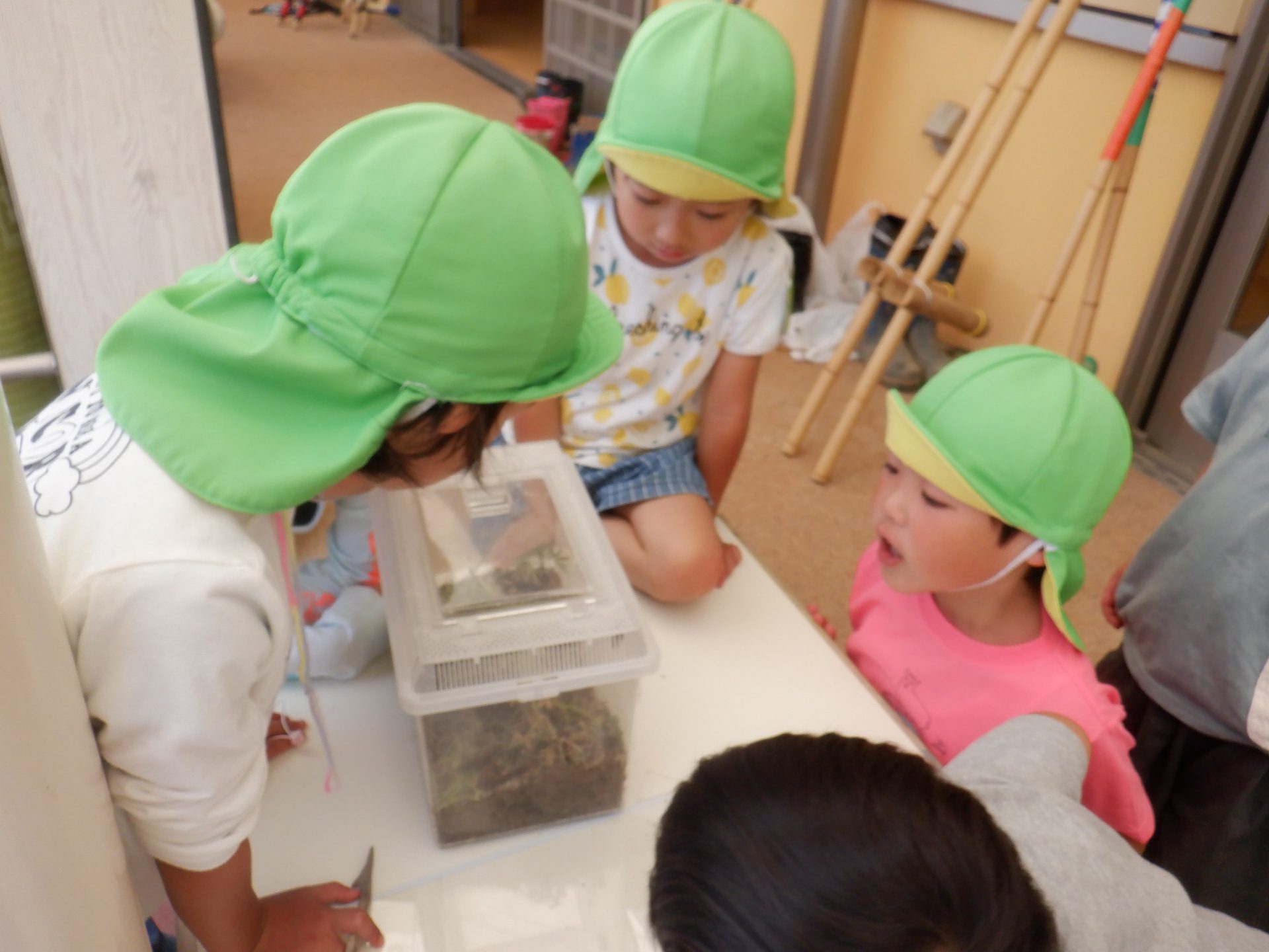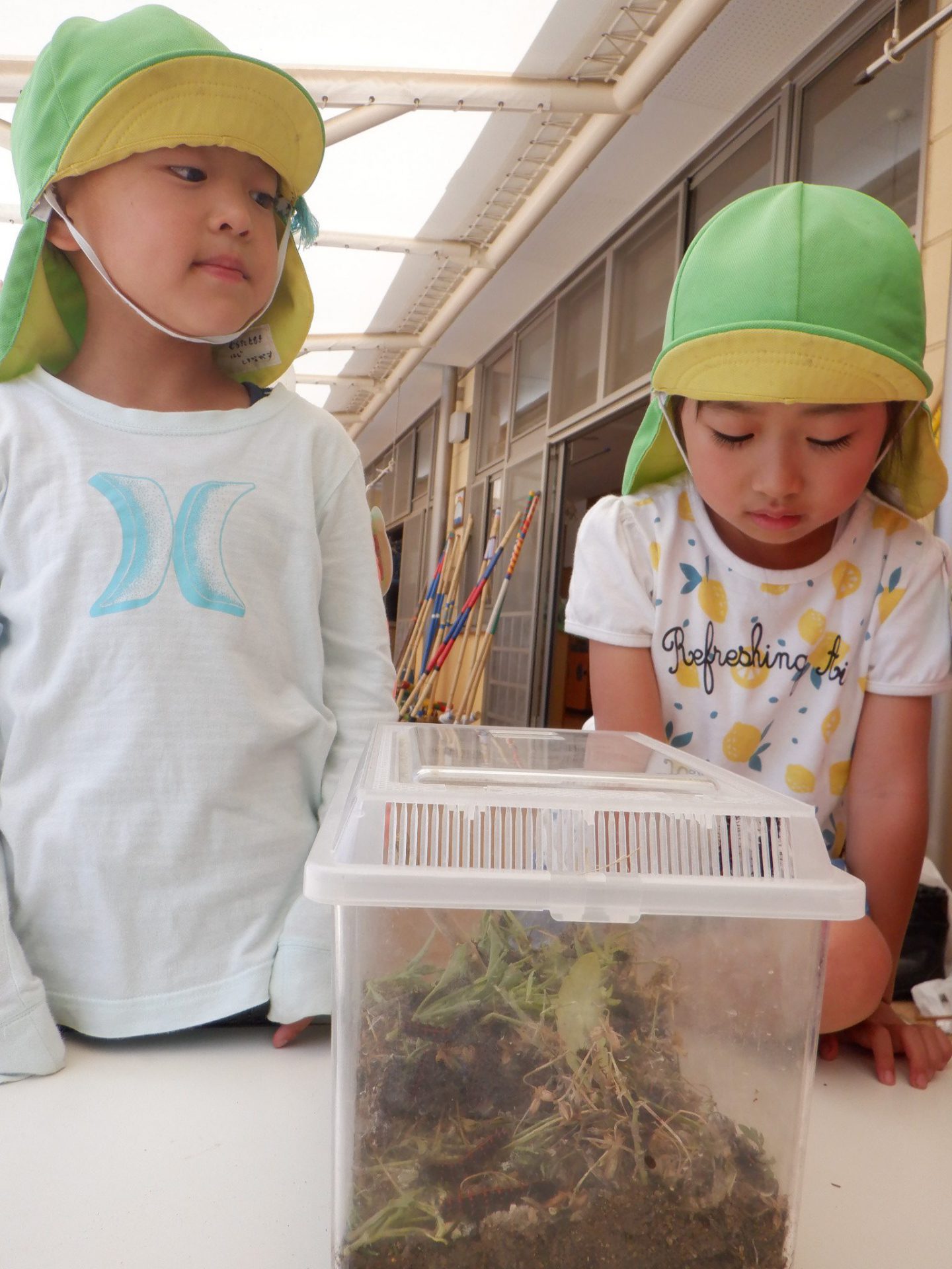 登園してきた時に、飼育ケースを覗いて変化を楽しみにしている子どもたち。お家の人も一緒に誘って観察する姿も見られます。