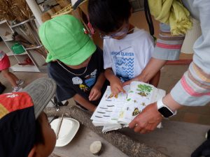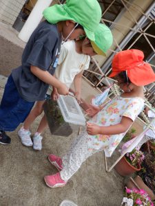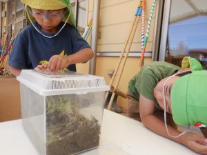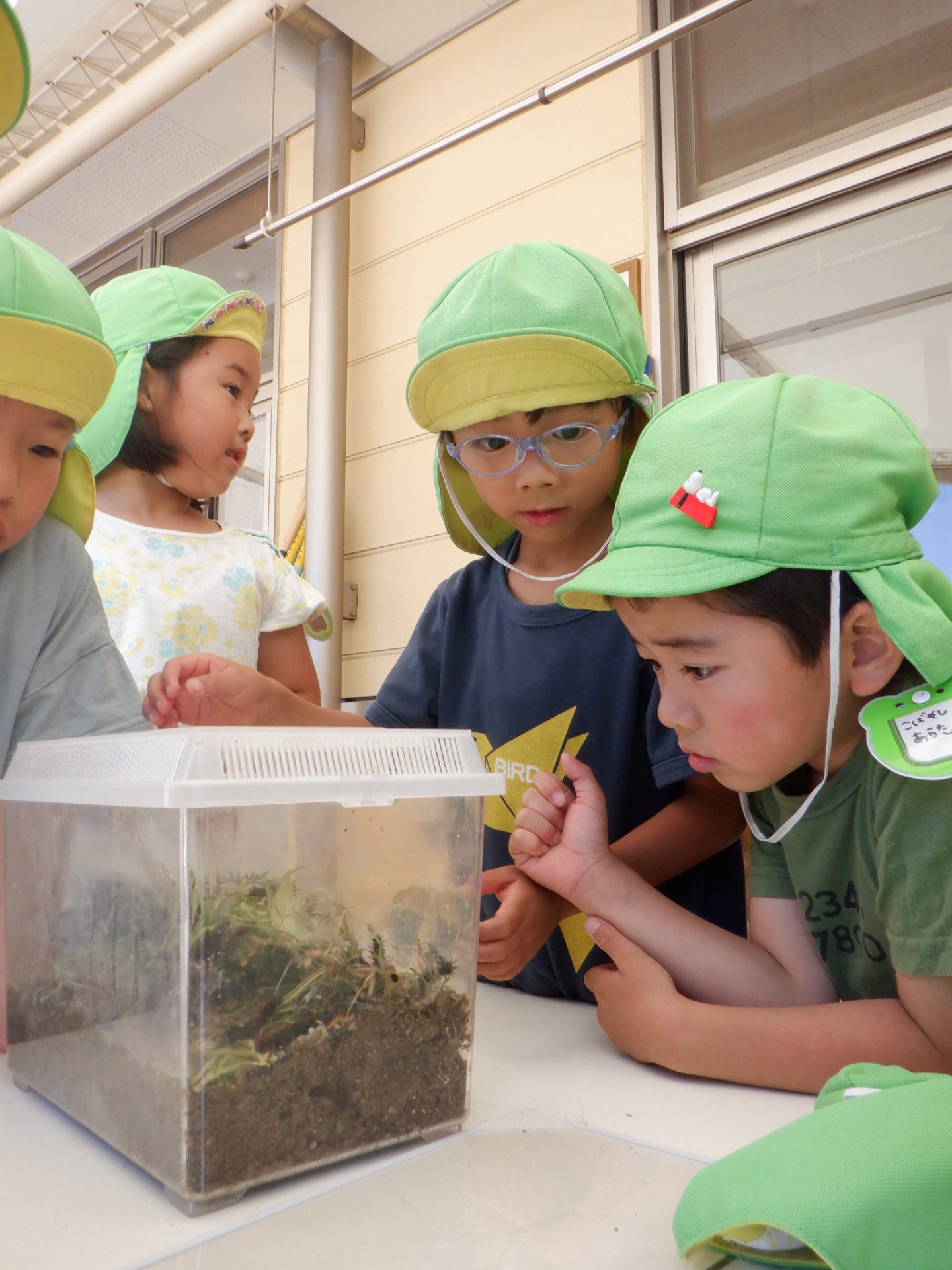 飼育ケースを覗き込みながら変化に気付いた子どもたち。