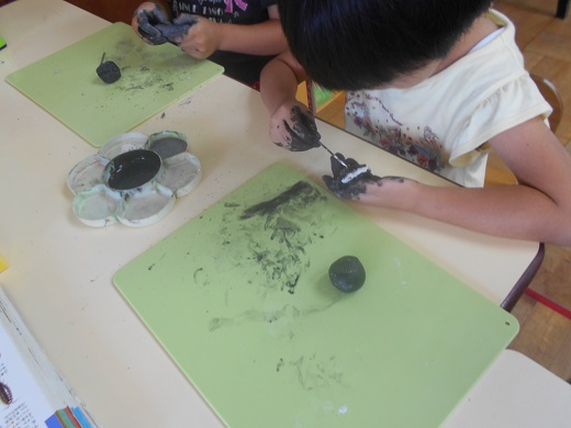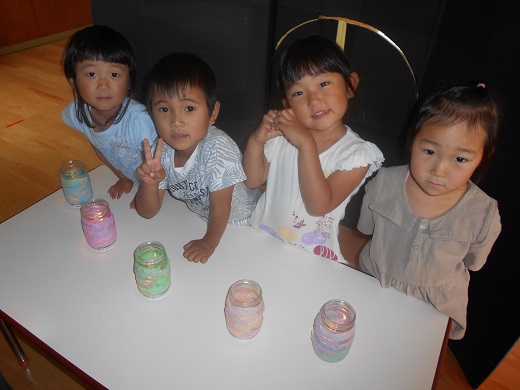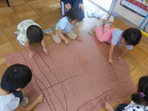 年少さんは初めて経験するようなことばかりでした。初めのころはのりの感触を嫌がる子もいましたが、今はそれよりも自分たちで何かを作るほうが楽しくて、夢中になって手も足ものりだらけ・・・になってました。