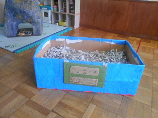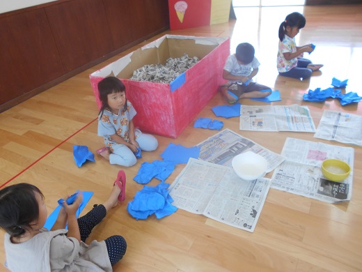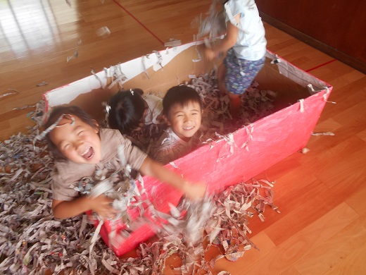 年中さんの宝探しプールは、新聞紙を細かく裂くところから始まりました。