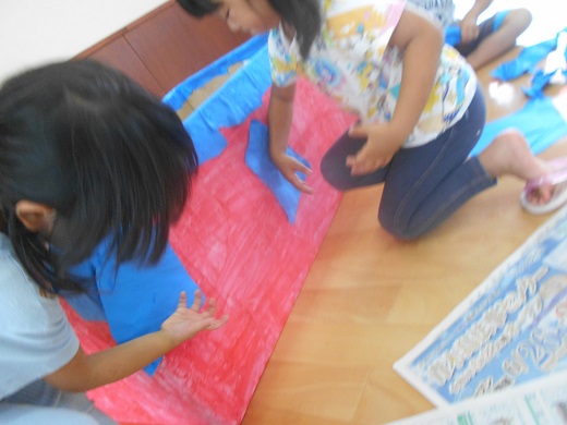 のりをダイナミックに使いながらこんな風に塗ると早いとか、ここもまだ赤いところがあるとか、友達と協力しながら取り組んでいました。