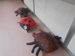 さすが、年長さんです。散歩先や園庭で出会う虫たちを様々な素材を使いながら作っていました。