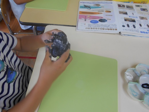 紙粘土を使ってミミズづくり。「おー、いいね~。」とあまりの出来栄えに大満足。紙粘土の素材の楽しさも感じたようで予定では紙を使ってダンゴ虫を作る予定でしたが紙粘土を使って作ることに変更となりました。