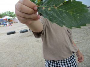 A児が「はっぱ~」と、保育士に取ってもらった園庭の木の葉っぱを見せに来てくれました。