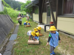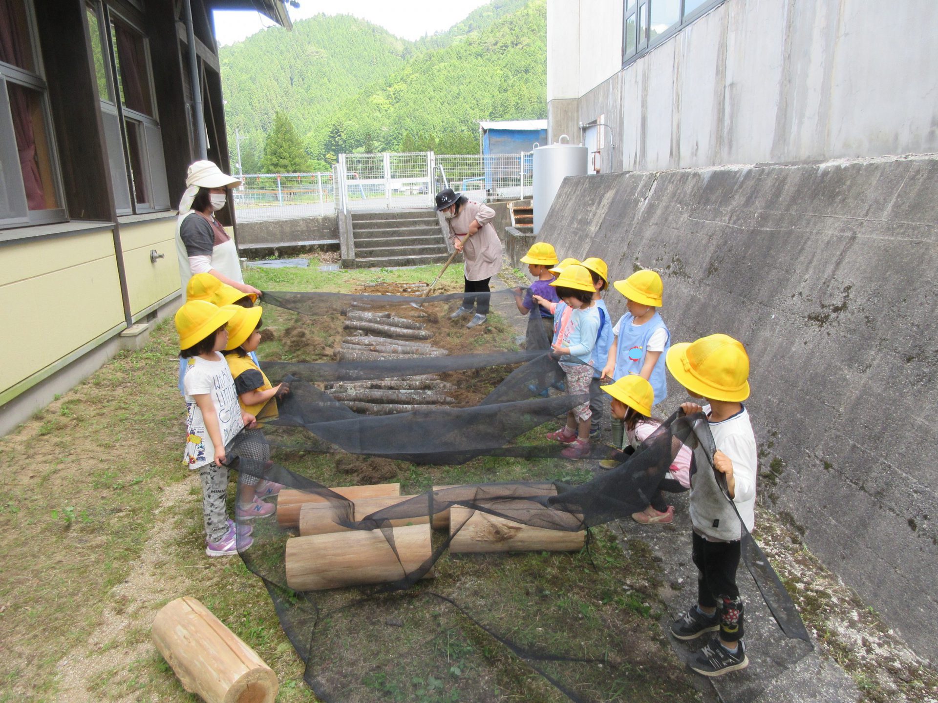菌打ち後、自分たちで木を運ぶ次の活動を通じてなめこ作りを楽しみにして欲しいと思いました。