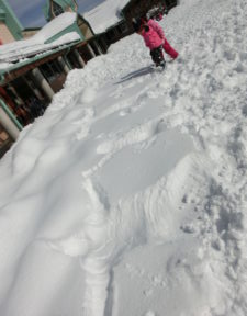 園庭はまだまだ雪でいっぱい。いろいろな遊び方を試して、発見してほしいです。