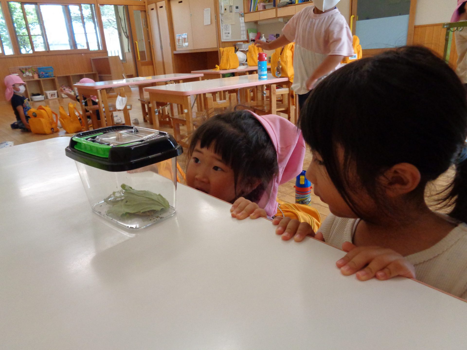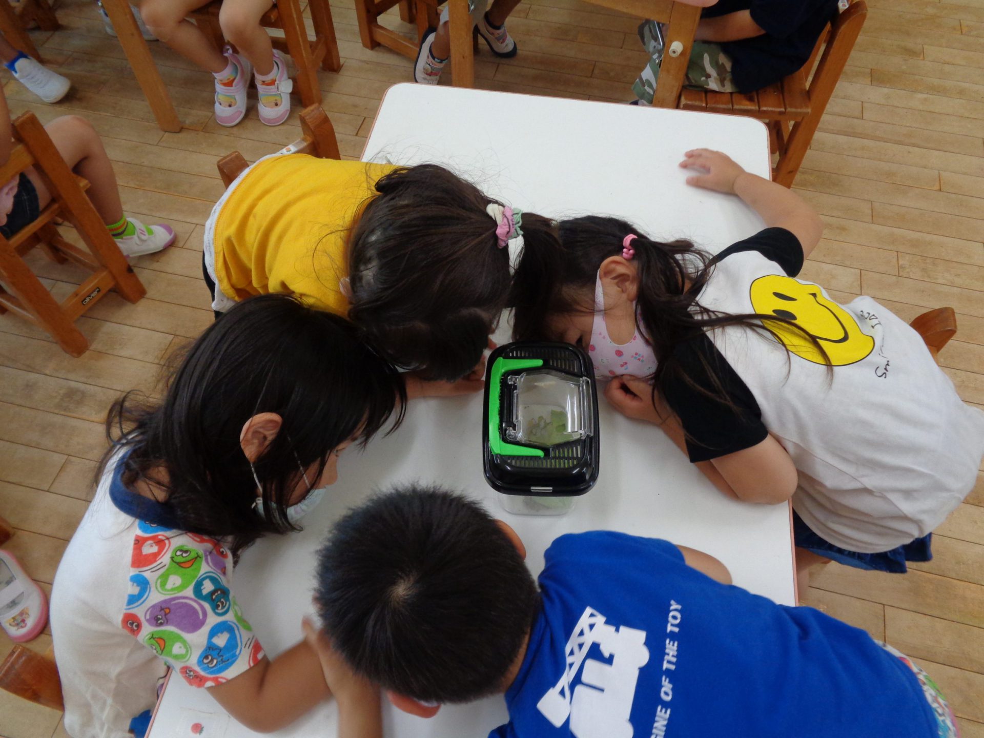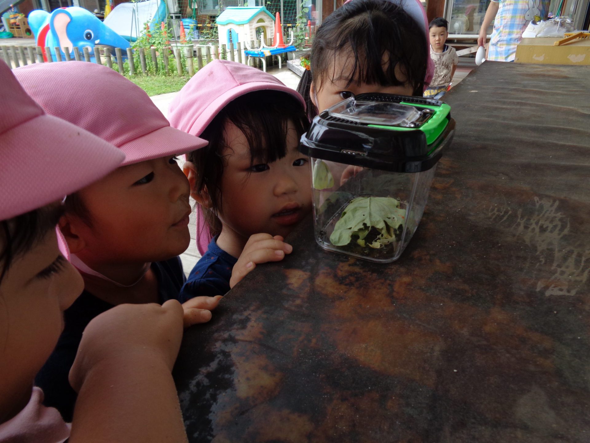 「さなぎになってちょうちょになる準備をしているんだよ」と伝えると「そうなんだ」と興味津々で見ていた子どもたち。