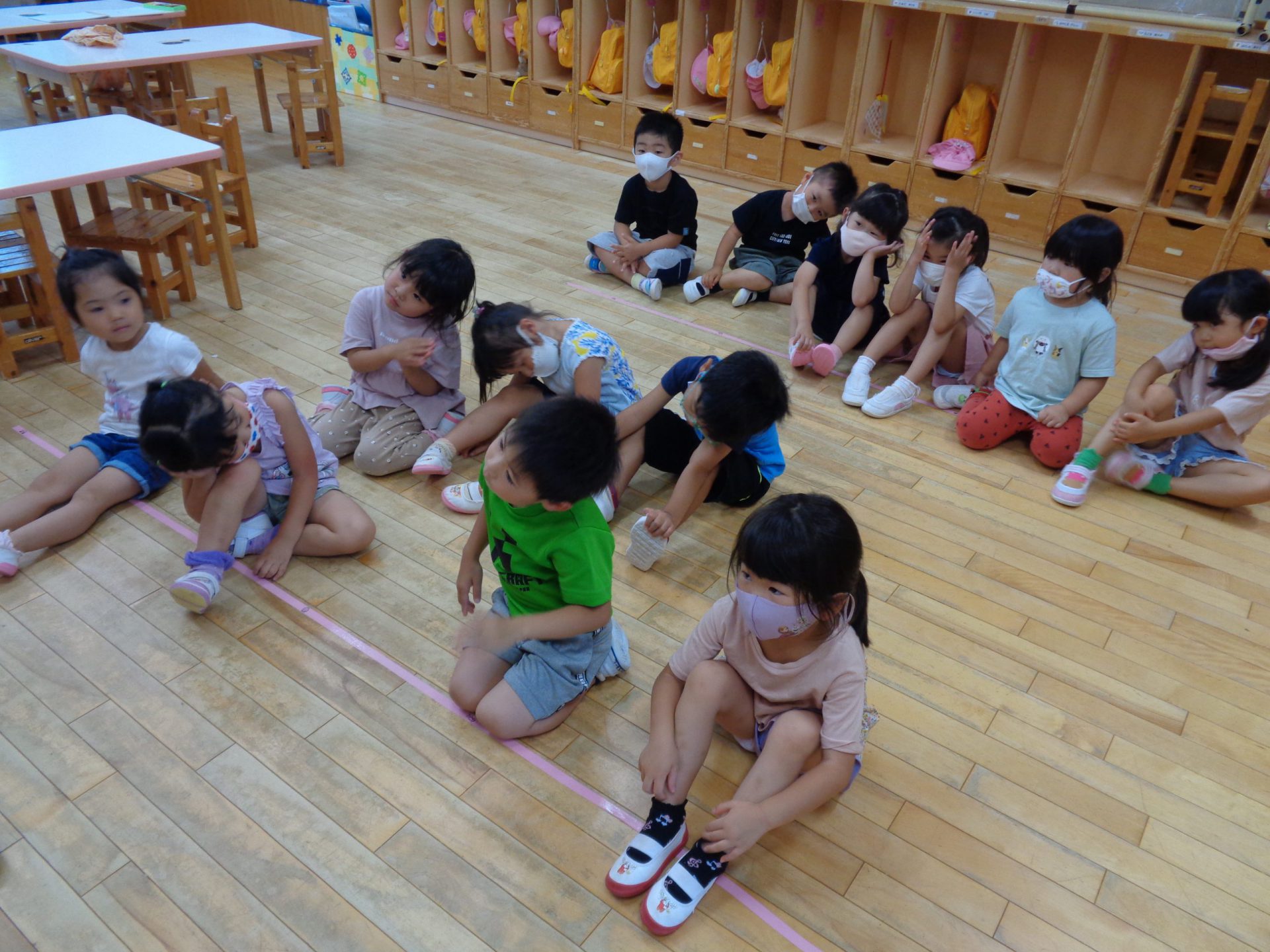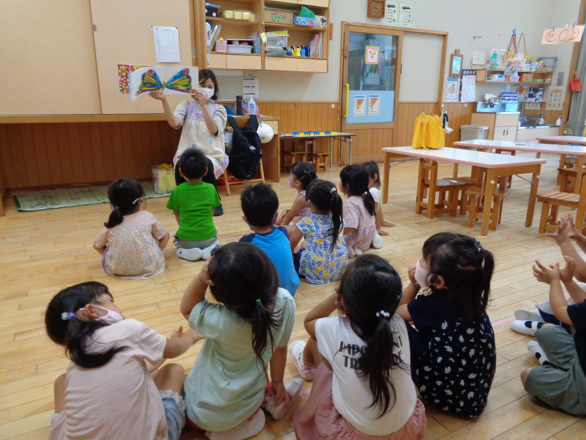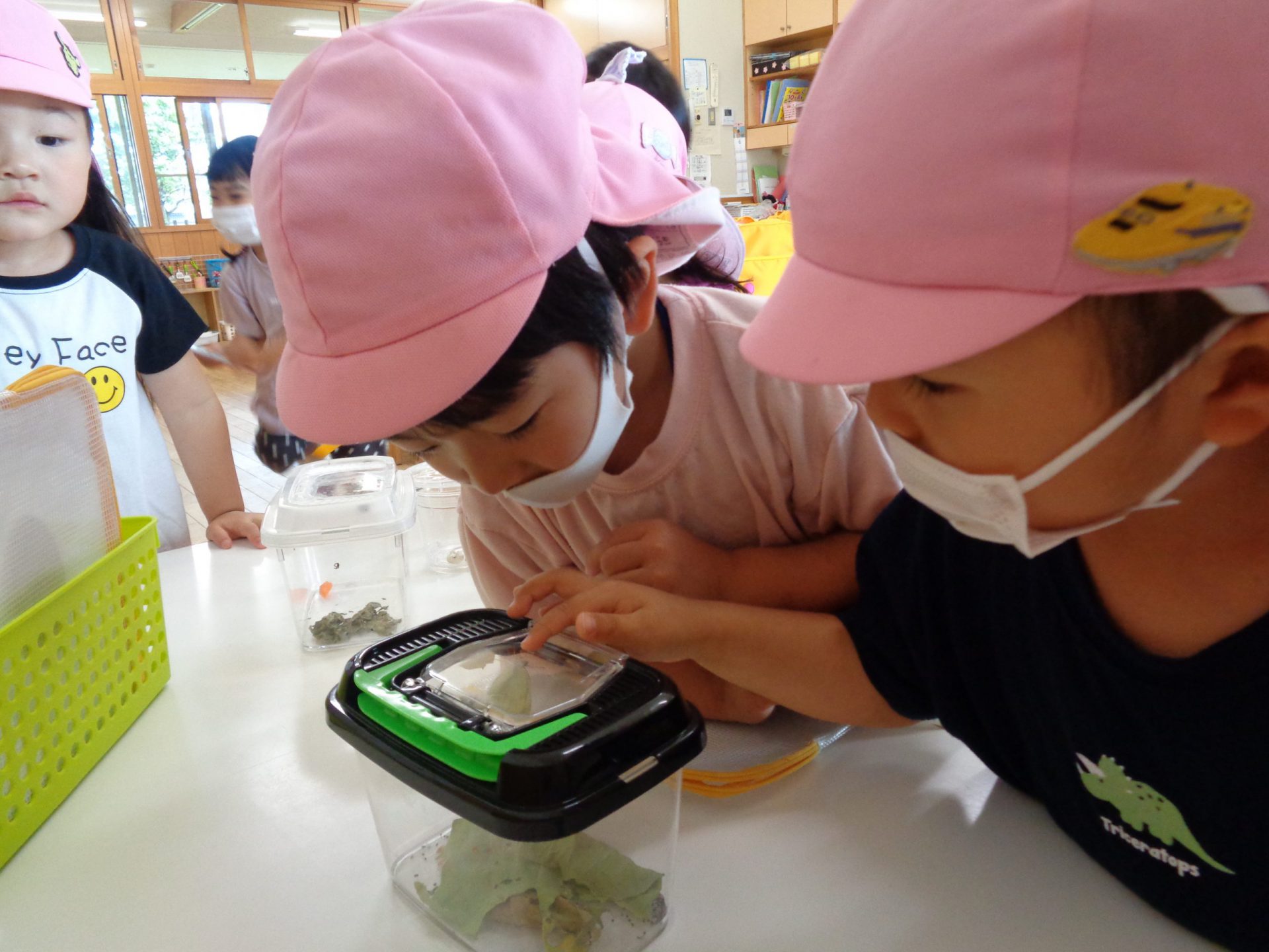 「さなぎになってちょうちょになる準備をしているんだよ」と伝えると「そうなんだ」と興味津々で見ていた子どもたち。
