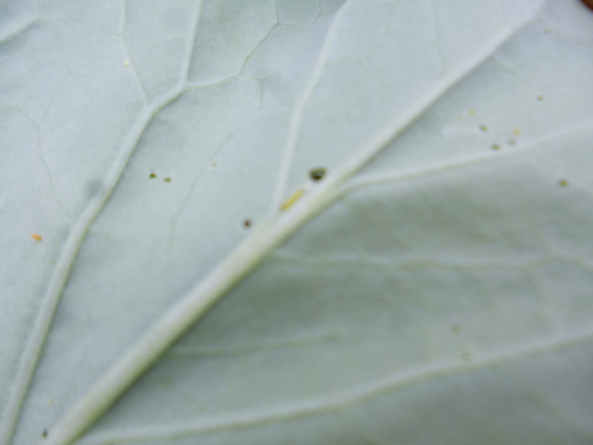 「何の卵かな?」と見ていると隣に小さなあおむしがいました。
