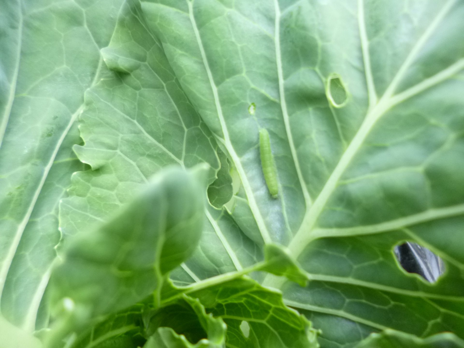 これは何のあおむしなんだろう?と図鑑を見てみるとモンシロチョウの幼虫でキャベツを食べるということがわかり、さっそく畑からキャベツを取ってきて虫かごに入れました。