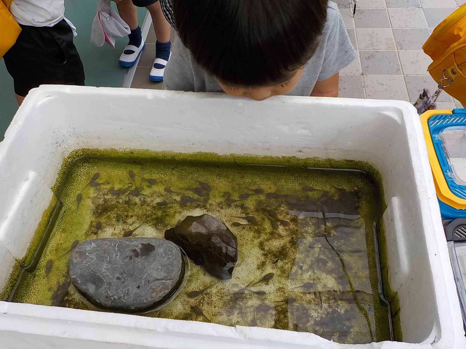 みんなで捕まえたおたまじゃくしは、クラスのテラスで飼うことになりました。